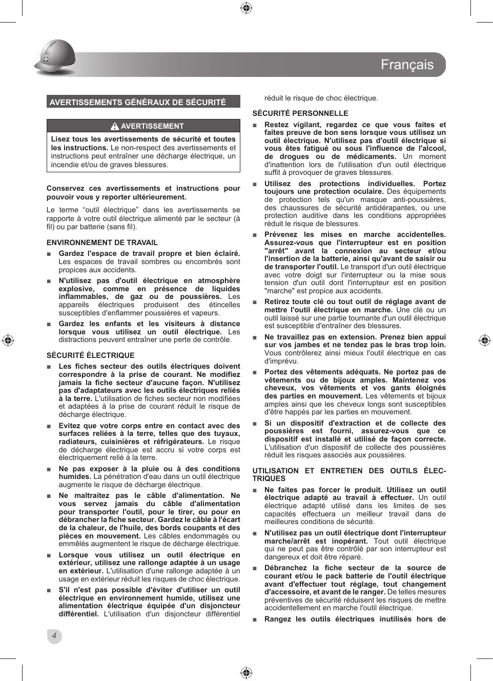 AVERTISSEMENTS GÉNÉRAUX DE SÉCURITÉ AVERTISSEMENT Lisez tous les avertissements de sécurité et toutes les instructions. Le non-respect des avertissements et instructions peut entraîner une décharge électrique, un LQFHQGLHHWRXGHJUDYHVEOHVVXUHV Conservez ces avertissements et instructions pour pouvoir vous y reporter ultérieurement. Le terme “outil électrique” dans les avertissements se rapporte à votre outil électrique alimenté par le secteur (à ¿O RXSDUEDWWHULH VDQV¿O ENVIRONNEMENT DE TRAVAIL Ŷ Gardez l'espace de travail propre et bien éclairé. Les espaces de travail sombres ou encombrés sont SURSLFHVDX[DFFLGHQWV Ŷ N'utilisez pas d'outil électrique en atmosphère explosive, comme en présence de liquides inflammables, de gaz ou de poussières. Les appareils électriques produisent des étincelles VXVFHSWLEOHVG HQIODPPHUSRXVVLqUHVHWYDSHXUV Ŷ Gardez les enfants et les visiteurs à distance lorsque vous utilisez un outil électrique. Les GLVWUDFWLRQVSHXYHQWHQWUDvQHUXQHSHUWHGHFRQWU{OH SÉCURITÉ ÉLECTRIQUE Ŷ Les fiches secteur des outils électriques doivent correspondre à la prise de courant. Ne modifiez jamais la fiche secteur d'aucune façon. N'utilisez pas d'adaptateurs avec les outils électriques reliés à la terre. L'utilisation de fiches secteur non modifiées et adaptées à la prise de courant réduit le risque de GpFKDUJHpOHFWULTXH Ŷ Evitez que votre corps entre en contact avec des surfaces reliées à la terre, telles que des tuyaux, radiateurs, cuisinières et réfrigérateurs. Le risque de décharge électrique est accru si votre corps est pOHFWULTXHPHQWUHOLpjODWHUUH Ŷ Ne pas exposer à la pluie ou à des conditions humides. La pénétration d'eau dans un outil électrique DXJPHQWHOHULVTXHGHGpFKDUJHpOHFWULTXH Ŷ Ne maltraitez pas le câble d'alimentation. Ne vous servez jamais du câble d'alimentation pour transporter l'outil, pour le tirer, ou pour en débrancher la fiche secteur. Gardez le câble à l'écart de la chaleur, de l'huile, des bords coupants et des pièces en mouvement. Les câbles endommagés ou HPPrOpVDXJPHQWHQWOHULVTXHGHGpFKDUJHpOHFWULTXH Ŷ Lorsque vous utilisez un outil électrique en extérieur, utilisez une rallonge adaptée à un usage en extérieur. L'utilisation d'une rallonge adaptée à un XVDJHHQH[WpULHXUUpGXLWOHVULVTXHVGHFKRFpOHFWULTXH Ŷ S'il n'est pas possible d'éviter d'utiliser un outil électrique en environnement humide, utilisez une alimentation électrique équipée d'un disjoncteur différentiel. / XWLOLVDWLRQ G XQ GLVMRQFWHXU GLIIpUHQWLHO