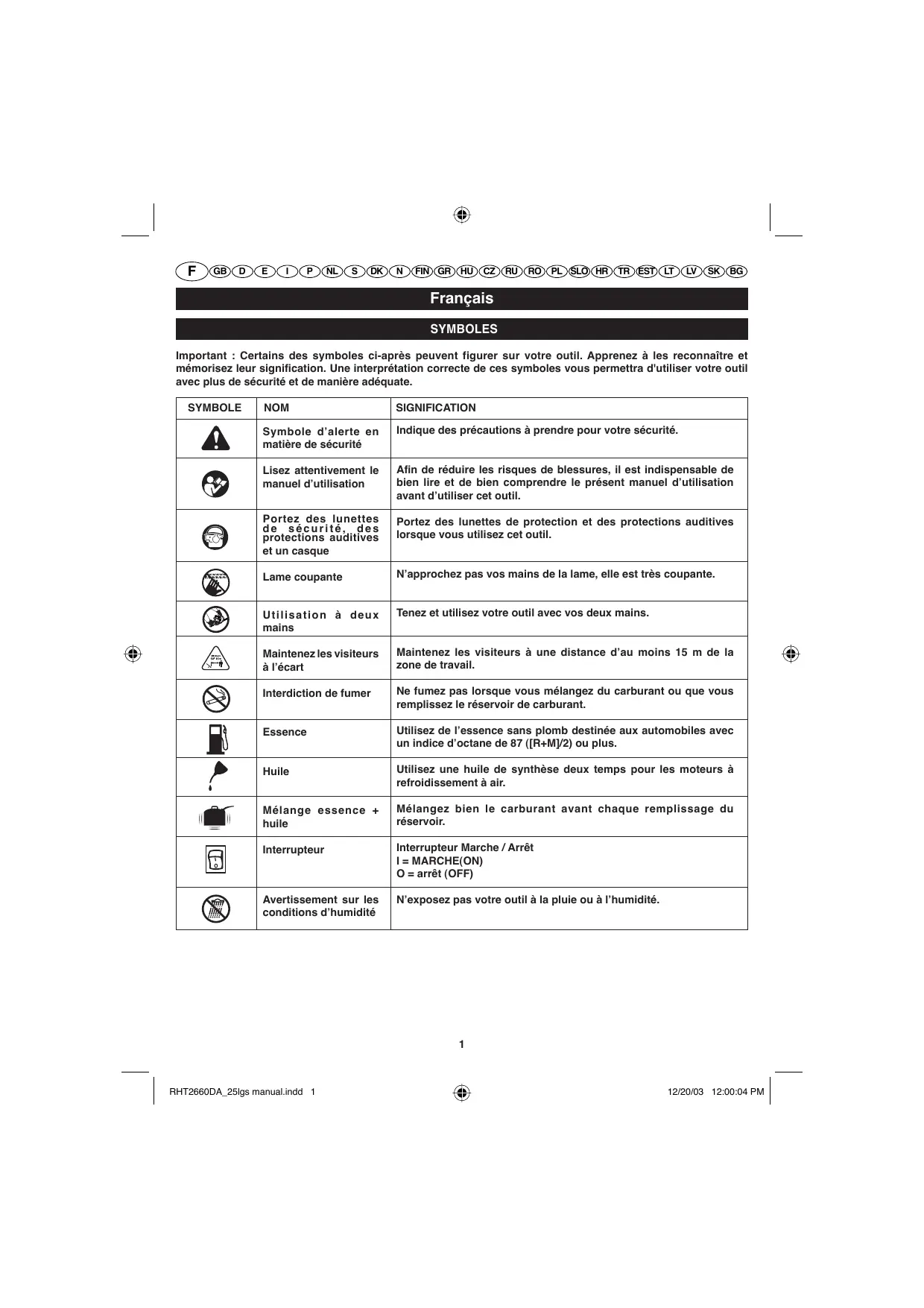 Il est indispensable que vous lisiez les instructions contenues dans ce manuel avant le montage et la mise en service de l’appareil. Important! Français SYMBOLES Important : Certains des symboles ci-après peuvent figurer sur votre outil. Apprenez à les reconnaître et mémorisez leur signification. Une interprétation correcte de ces symboles vous permettra d'utiliser votre outil avec plus de sécurité et de manière adéquate. SYMBOLE NOM SIGNIFICATION Symbole dʼalerte en matière de sécurité Indique des précautions à prendre pour votre sécurité. Lisez attentivement le manuel dʼutilisation Afin de réduire les risques de blessures, il est indispensable de bien lire et de bien comprendre le présent manuel dʼutilisation avant dʼutiliser cet outil. Portez des lunettes de sécurité, des protections auditives et un casque Portez des lunettes de protection et des protections auditives lorsque vous utilisez cet outil. Lame coupante Nʼapprochez pas vos mains de la lame, elle est très coupante. Utilisation à deux mains Tenez et utilisez votre outil avec vos deux mains. Maintenez les visiteurs à lʼécart Maintenez les visiteurs à une distance dʼau moins 15 m de la zone de travail. Interdiction de fumer Ne fumez pas lorsque vous mélangez du carburant ou que vous remplissez le réservoir de carburant. Essence Utilisez de lʼessence sans plomb destinée aux automobiles avec un indice dʼoctane de 87 ([R+M]/2) ou plus. Huile Utilisez une huile de synthèse deux temps pour les moteurs à refroidissement à air. Mélange essence + huile Mélangez bien le carburant avant chaque remplissage du réservoir. Interrupteur Interrupteur Marche / Arrêt I = MARCHE(ON) O = arrêt (OFF) Avertissement sur les conditions dʼhumidité Nʼexposez pas votre outil à la pluie ou à lʼhumidité.