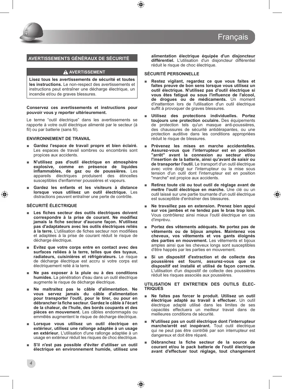 Français alimentation électrique équipée d'un disjoncteur différentiel. / XWLOLVDWLRQ G XQ GLVMRQFWHXU GLIIpUHQWLHO UpGXLWOHULVTXHGHFKRFpOHFWULTXH AVERTISSEMENTS GÉNÉRAUX DE SÉCURITÉ AVERTISSEMENT Lisez tous les avertissements de sécurité et toutes les instructions. Le non-respect des avertissements et instructions peut entraîner une décharge électrique, un LQFHQGLHHWRXGHJUDYHVEOHVVXUHV Conservez ces avertissements et instructions pour pouvoir vous y reporter ultérieurement. Le terme “outil électrique” dans les avertissements se rapporte à votre outil électrique alimenté par le secteur (à
