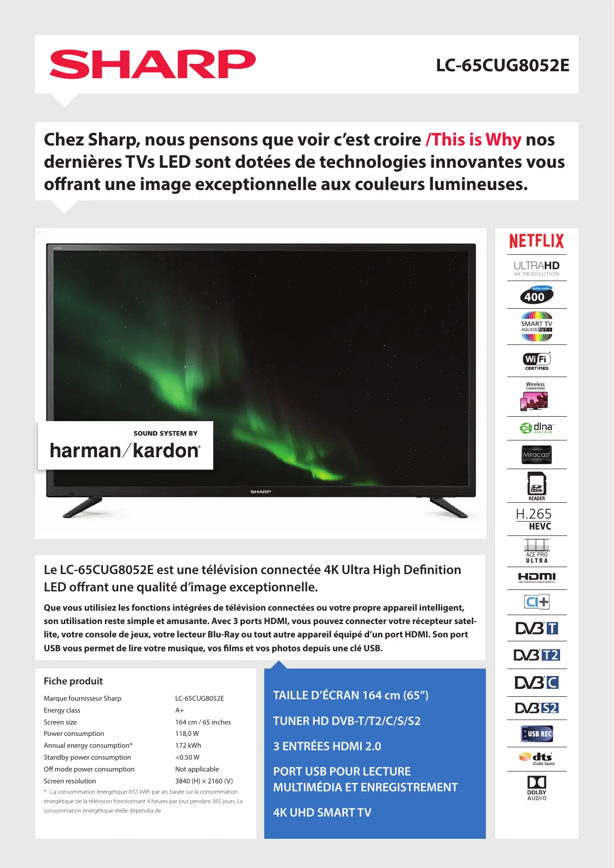 Wireless Connection H.265 HEVC Le LC-65CUG8052E est une télévision connectée 4K Ultra High Definition LED offrant une qualité d’image exceptionnelle. Que vous utilisiez les fonctions intégrées de télévision connectées ou votre propre appareil intelligent, son utilisation reste simple et amusante. Avec 3 ports HDMI, vous pouvez connecter votre récepteur satellite, votre console de jeux, votre lecteur Blu-Ray ou tout autre appareil équipé d’un port HDMI. Son port USB vous permet de lire votre musique, vos films et vos photos depuis une clé USB. Fiche produit Marque fournisseur Sharp