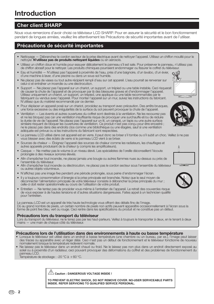 Introduction Cher client SHARP Nous vous remercions d’avoir choisi ce téléviseur LCD SHARP. Pour en assurer la sécurité et le bon fonctionnement pendant de longues années, veuillez lire attentivement les Précautions de sécurité importantes avant de l’utiliser. Précautions de sécurité importantes