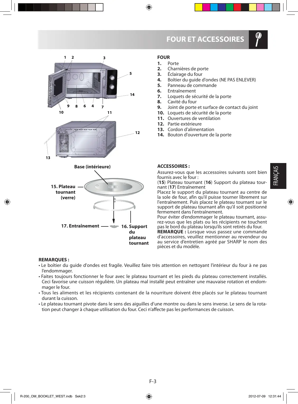 - Le plateau tournant pivote dans le sens des aiguilles d’une montre ou dans le sens inverse. Le sens de la rotation peut changer à chaque utilisation du four. Ceci n’affecte pas les performances de cuisson. F-3 R-200_OM_BOOKLET_WEST.indb Sek2:3 2012-07-09 12:31:44