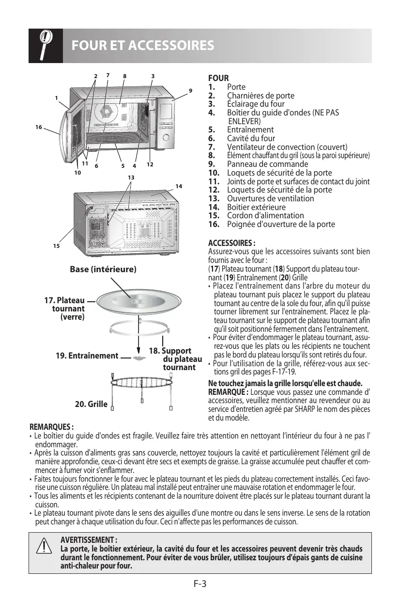 pas le bord du plateau lorsqu’ils sont retirés du four. du plateau • Pour l'utilisation de la grille, référez-vous aux sectournant tions gril des pages F-17-19. Ne touchez jamais la grille lorsqu'elle est chaude. REMARQUE : Lorsque vous passez une commande d’ accessoires, veuillez mentionner au revendeur ou au service d’entretien agréé par SHARP le nom des pièces et du modèle. REMARQUES :