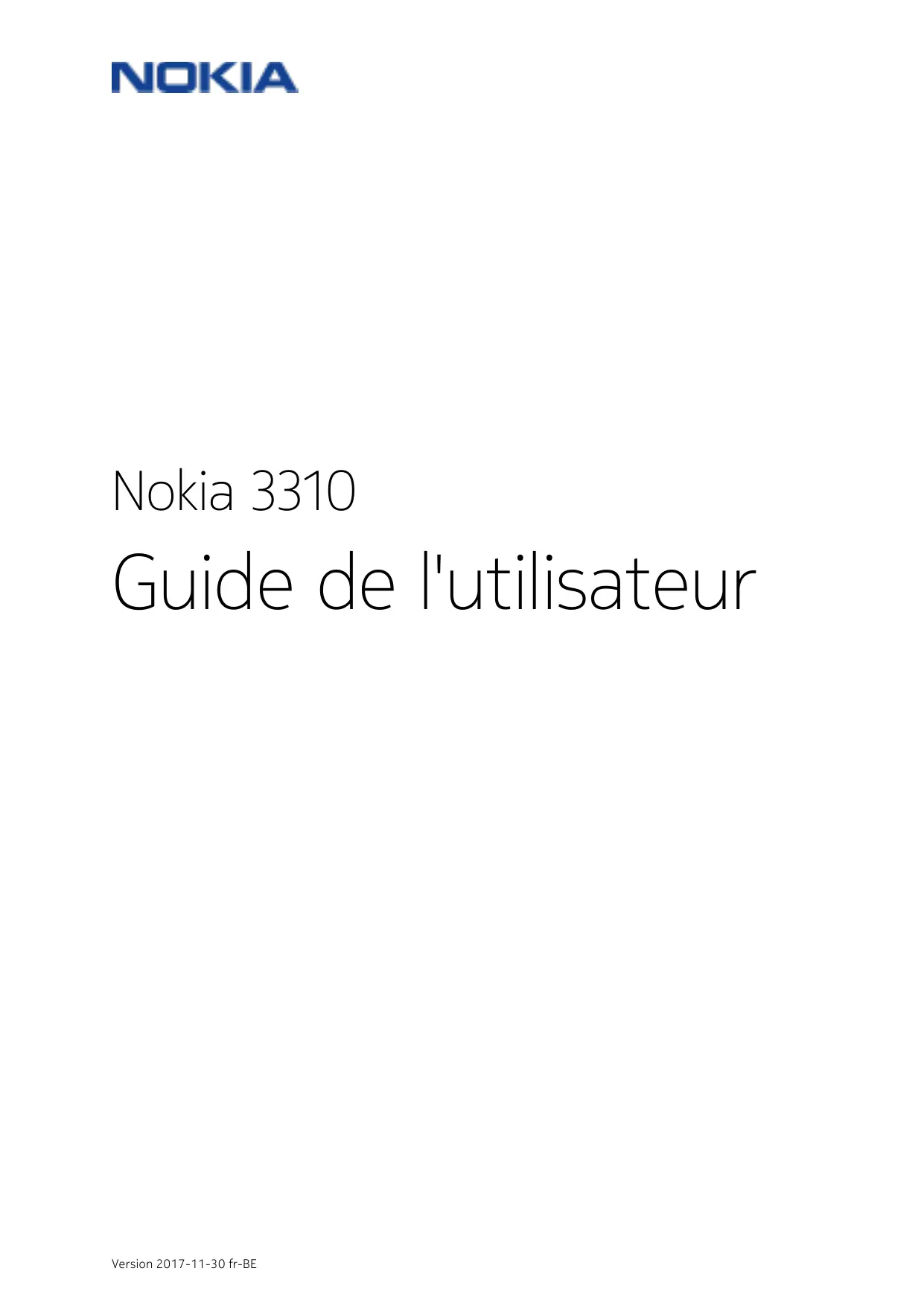 Nokia 3310 Guide de l'utilisateur À propos de ce guide d'utilisation Important : Pour obtenir des informations importantes sur la sécurité d'utilisation de O votre appareil et de la batterie, consultez " Pour votre sécurité " et " Sécurité du produit " dans le guide d'utilisation imprimé ou sur www.nokia.com/support avant d'utiliser l'appareil. Pour découvrir comment commencer à utiliser votre nouvel appareil, consultez le guide d'utilisation imprimé. © 2017 HMD Global Oy. Tous droits réservés.