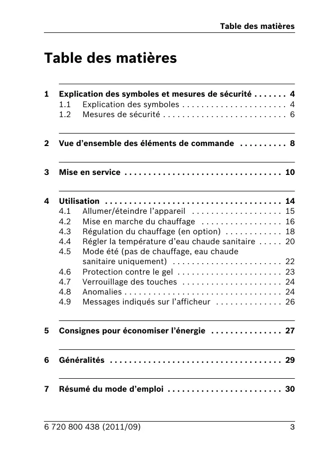 4.1 Allumer/éteindre l'appareil 15 4.2 Mise en marche du chauffage 16 4.3 Régulation du chauffage (en option) 18 4.4 Régler la température d'eau chaude sanitaire 20 4.5 Mode été (pas de chauffage, eau chaude sanitaire uniquement) 22 4.6 Protection contre le gel 23 4.7 Verrouillage des touches 24 4.8 Anomalies 24 4.9 Messages indiqués sur l'afficheur 26