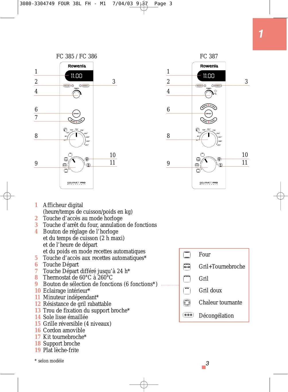 1 Afficheur digital (heure/temps de cuisson/poids en kg) 2 Touche d'accès au mode horloge 3 Touche d'arrêt du four, annulation de fonctions 4 Bouton de réglage de l'horloge et du temps de cuisson (2 h maxi) et de l'heure de départ et du poids en mode recettes automatiques 5 Touche d'accès aux recettes automatiques 6 Touche Départ 7 Touche Départ différé jusqu'à 24 h 8 Thermostat de 60°C à 260°C 9 Bouton de sélection de fonctions (6 fonctions) 10 Éclairage intérieur 11 Minuterie indépendante* 12 Résistance de gril rabattable 13 Trou de fixation du support broche 14 Sole lisse émaillée 15 Grille réversible (4 niveaux) 16 Cordon amovible 17 Kit tournebroche 18 Support broche 19 Plat léche-frite
