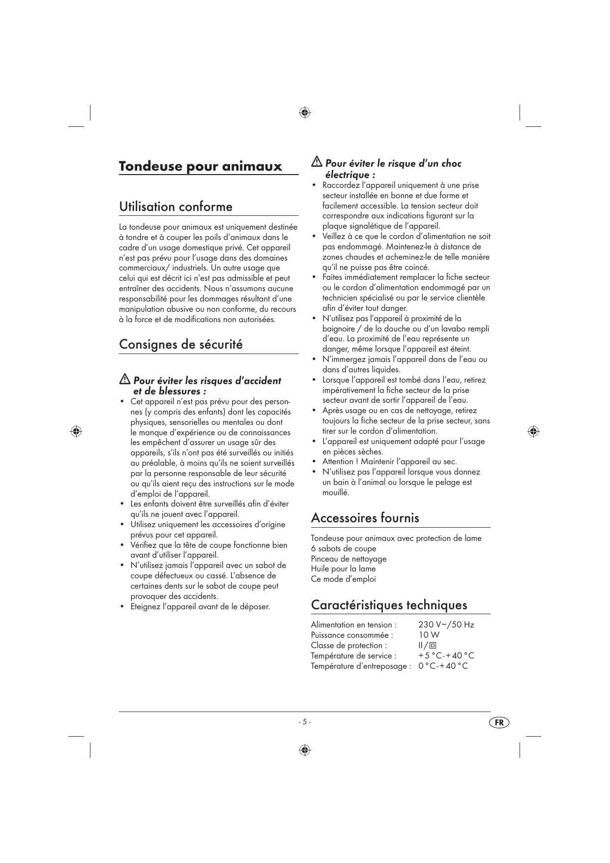 La tondeuse pour animaux est uniquement destinée à tondre et à couper les poils d'animaux dans le cadre d'un usage domestique隱私é. Cet apparéil n'est pas prévu pour l'utilisation dans des domaines commerciaux/ industriels. Un autre usage que celui qui est précrit ici n'est pas admissible et peut entraîner des accidents. Nous n'assumons aucune responsabilité pour les dommages résultat d'une manipulation abusive ou non conforme, du recours à la force et de modifications non autorisées.