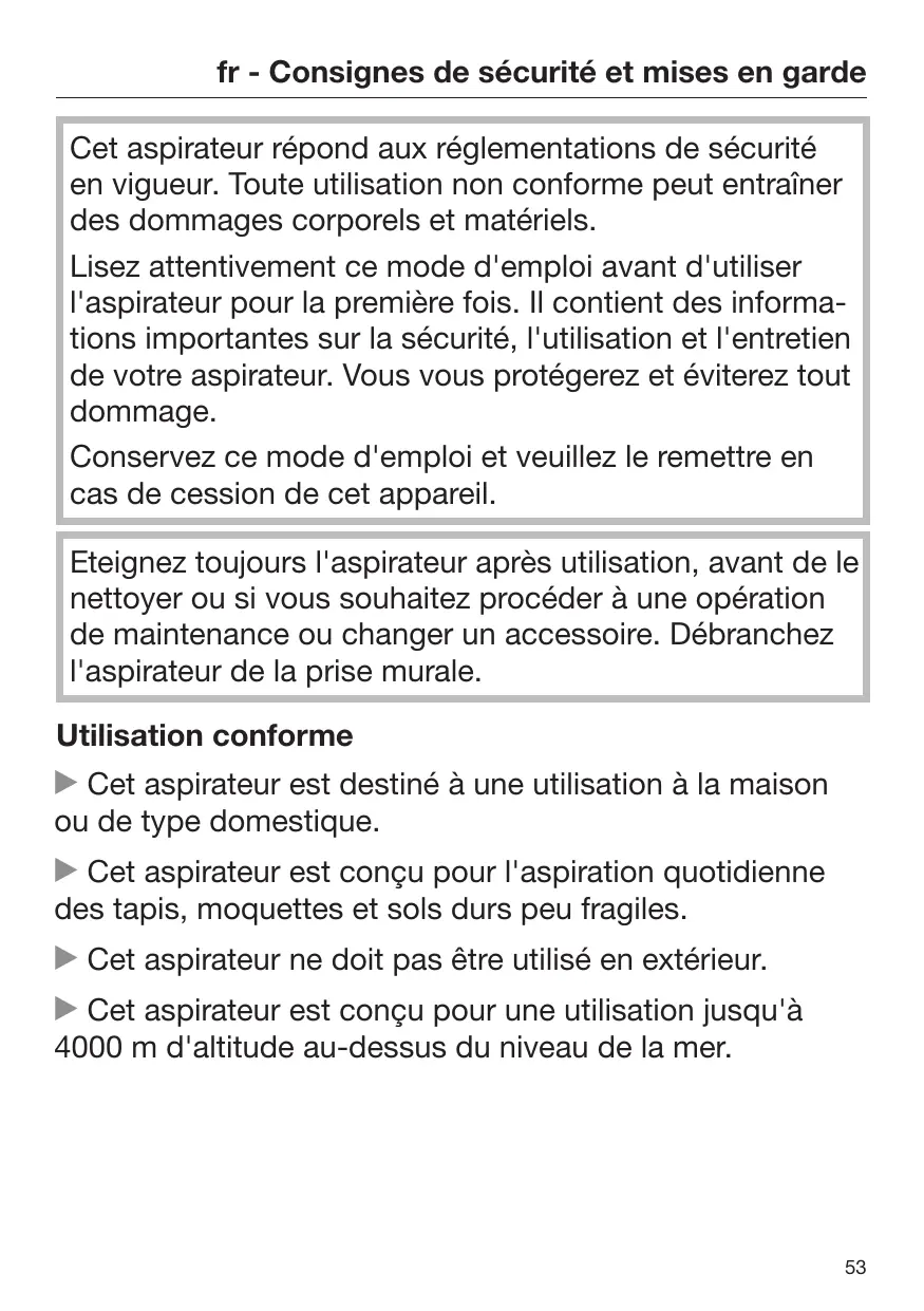fr - Consignes de sécurité et mises en garde Cet aspirateur répond aux réglementations de sécurité en vigueur. Toute utilisation non conforme peut entraîner des dommages corporels et matériels. Lisez attentivement ce mode d'emploi avant d'utiliser l'aspirateur pour la première fois. Il contient des informations importantes sur la sécurité, l'utilisation et l'entretien de votre aspirateur. Vous vous protégerez et éviterez tout dommage. Conservez ce mode d'emploi et veuillez le remettre en cas de cession de cet appareil. Eteignez toujours l'aspirateur après utilisation, avant de le nettoyer ou si vous souhaitez procéder à une opération de maintenance ou changer un accessoire. Débranchez l'aspirateur de la prise murale. Utilisation conforme Cet aspirateur est destiné à une utilisation à la maison ou de type domestique. Cet aspirateur est conçu pour l'aspiration quotidienne des tapis, moquettes et sols durs peu fragiles. Cet aspirateur ne doit pas être utilisé en extérieur. Cet aspirateur est conçu pour une utilisation jusqu'à 4000 m d'altitude au-dessus du niveau de la mer.