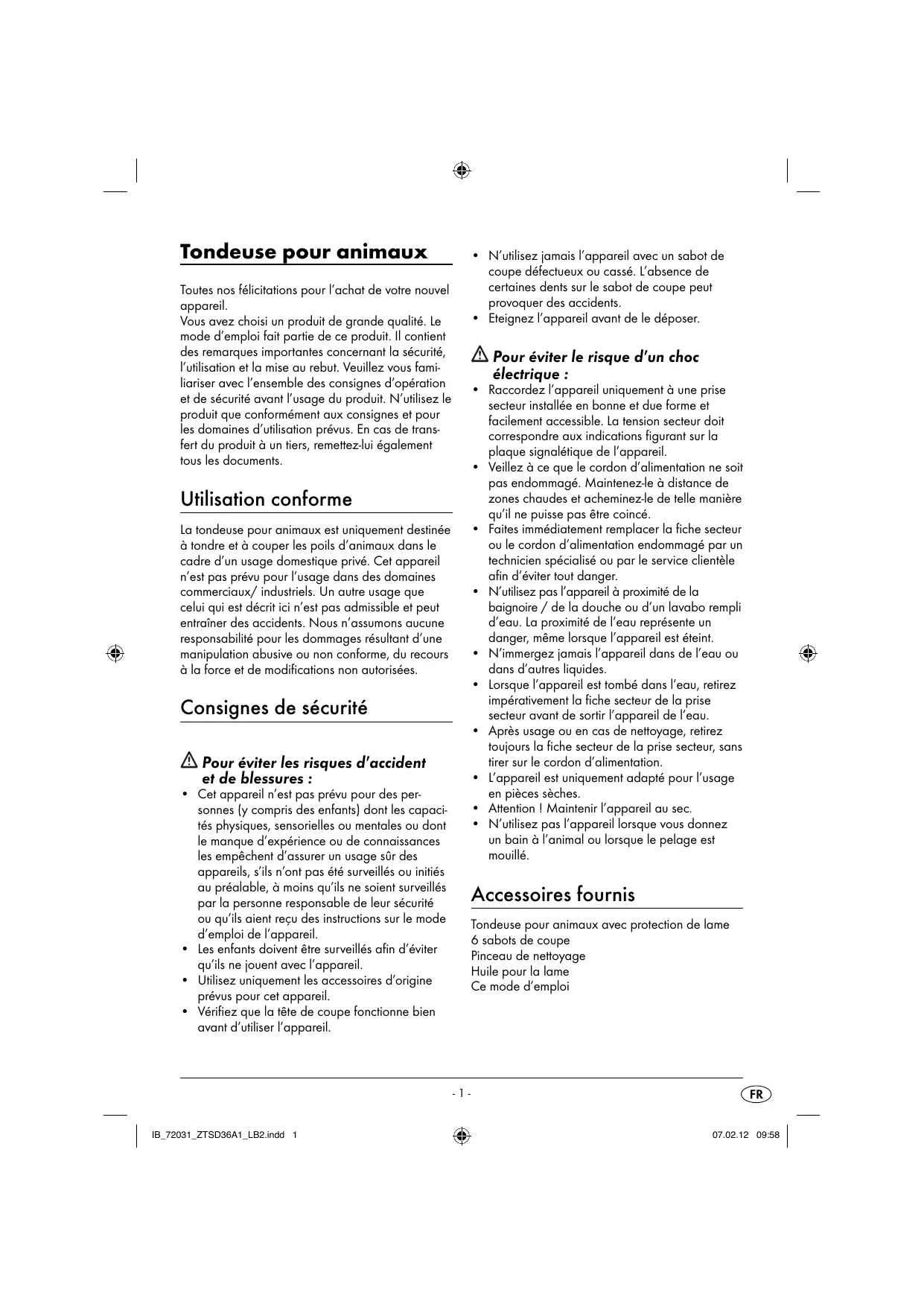 La tondeuse pour animaux est uniquement destinée à tondre et à couper les poils d'animaux dans le cadre d'un usage domestique隱私é. Cet apparéil n'est pas prévu pour l'utilisation dans des domaines commerciaux/ industriels. Un autre usage que celui qui est précrit ici n'est pas admissible et peut entraîner des accidents. Nous n'assumons aucune responsabilité pour les dommages résultat d'une manipulation abusive ou non conforme, du recours à la force et de modifications non autorisées.
