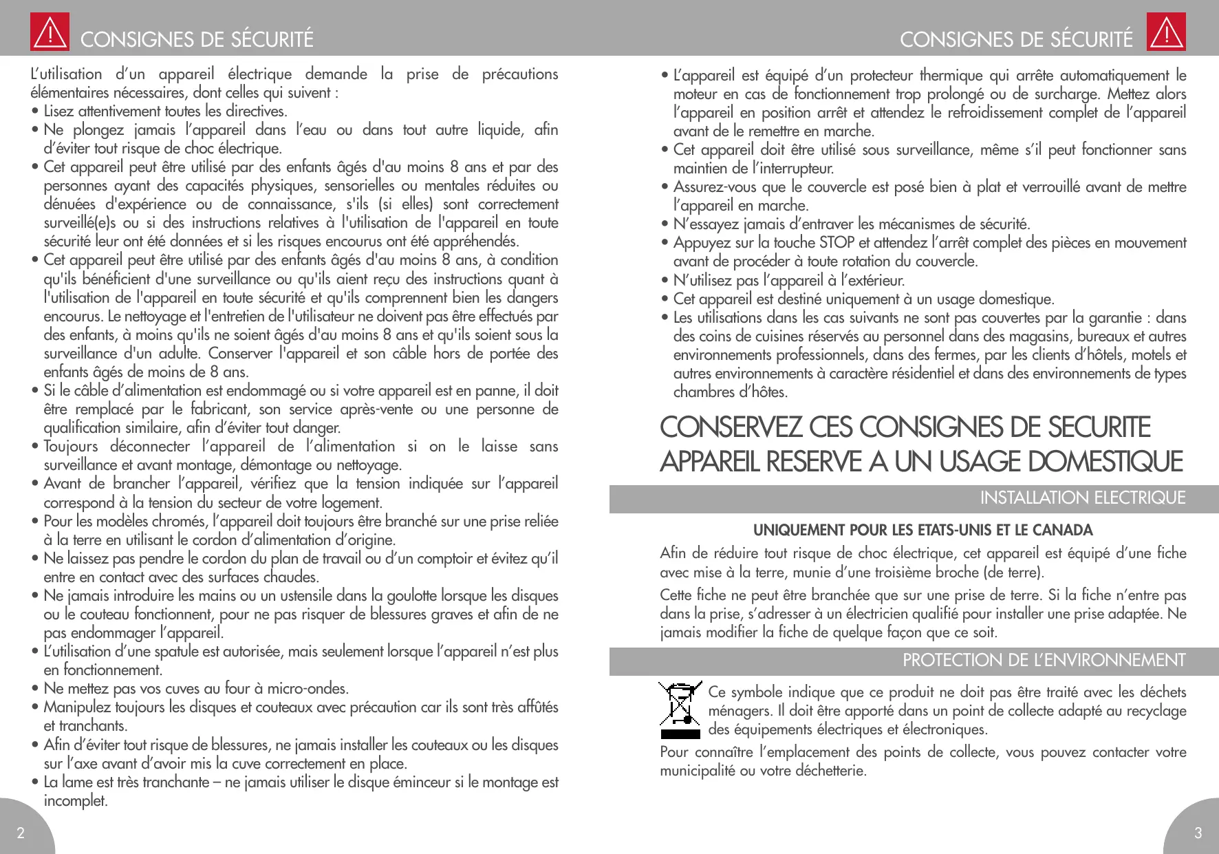 L’utilisation d’un appareil électrique demande la prise de précautions élémentaires nécessaires, dont celles qui suivent : • Lisez attentivement toutes les directives. • Ne plongez jamais l’appareil dans l’eau ou dans tout autre liquide, afin d’éviter tout risque de choc électrique. • Cet appareil peut être utilisé par des enfants âgés d'au moins 8 ans et par des personnes ayant des capacités physiques, sensorielles ou mentales réduites ou dénuées d'expérience ou de connaissance, s'ils (si elles) sont correctement surveillé(e)s ou si des instructions relatives à l'utilisation de l'appareil en toute sécurité leur ont été données et si les risques encourus ont été appréhendés. • Cet appareil peut être utilisé par des enfants âgés d'au moins 8 ans, à condition qu'ils bénéficient d'une surveillance ou qu'ils aient reçu des instructions quant à l'utilisation de l'appareil en toute sécurité et qu'ils comprennent bien les dangers encourus. Le nettoyage et l'entretien de l'utilisateur ne doivent pas être effectués par des enfants, à moins qu'ils ne soient âgés d'au moins 8 ans et qu'ils soient sous la surveillance d'un adulte. Conserver l'appareil et son câble hors de portée des enfants âgés de moins de 8 ans. • Si le câble d’alimentation est endommagé ou si votre appareil est en panne, il doit être remplacé par le fabricant, son service après-vente ou une personne de qualification similaire, afin d’éviter tout danger. • Toujours déconnecter l’appareil de l’alimentation si on le laisse sans surveillance et avant montage, démontage ou nettoyage. • Avant de brancher l’appareil, vérifiez que la tension indiquée sur l’appareil correspond à la tension du secteur de votre logement. • Pour les modèles chromés, l’appareil doit toujours être branché sur une prise reliée à la terre en utilisant le cordon d’alimentation d’origine. • Ne laissez pas pendre le cordon du plan de travail ou d’un comptoir et évitez qu’il entre en contact avec des surfaces chaudes. • Ne jamais introduire les mains ou un ustensile dans la goulotte lorsque les disques ou le couteau fonctionnent, pour ne pas risquer de blessures graves et afin de ne pas endommager l’appareil. • L’utilisation d’une spatule est autorisée, mais seulement lorsque l’appareil n’est plus en fonctionnement. • Ne mettez pas vos cuves au four à micro-ondes. • Manipulez toujours les disques et couteaux avec précaution car ils sont très affûtés et tranchants. • Afin d’éviter tout risque de blessures, ne jamais installer les couteaux ou les disques sur l’axe avant d’avoir mis la cuve correctement en place. • La lame est très tranchante – ne jamais utiliser le disque éminceur si le montage est incomplet. 2