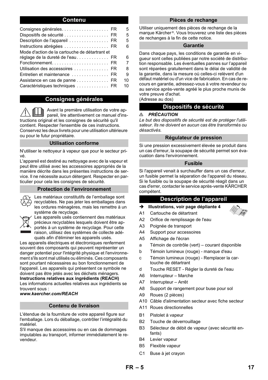 Consignes générales Avant la première utilisation de votre appareil, lire attentivement ce manuel d'instructions original et les consignes de sécurité qu'il contient. Respecter l'ensemble de ces instructions. Conservez les deux livrets pour une utilisation ultérieure ou pour le futur propriétaire. Utilisation conforme N'utiliser le nettoyeur à vapeur que pour le secteur privé. L'appareil est destiné au nettoyage avec de la vapeur et peut être utilisé avec les accessoires appropriés de la manière décrite dans les présentes instructions de service. Il ne nécessite aucun détergent. Respecter en particulier pour cela les consignes de sécurité. Protection de l’environnement Les matériaux constitutifs de l’emballage sont recyclables. Ne pas jeter les emballages dans les ordures ménagères, mais les remettre à un système de recyclage. Les appareils usés contiennent des matériaux précieux recyclables lesquels doivent être apportés à un système de recyclage. Pour cette raison, utilisez des systèmes de collecte adéquats afin d'éliminer les appareils usés. Les appareils électriques et électroniques renferment souvent des composants qui peuvent représenter un danger potentiel pour l'intégrité physique et l'environnement s'ils sont mal utilisés ou éliminés. Ces composants sont pourtant nécessaires au bon fonctionnement de l'appareil. Les appareils qui présentent ce symbole ne doivent pas être jetés avec les déchets ménagers. Instructions relatives aux ingrédients (REACH) Les informations actuelles relatives aux ingrédients se trouvent sous : www.kaercher.com/REACH Contenu de livraison L'étendue de la fourniture de votre appareil figure sur l'emballage. Lors du déballage, contrôler l’intégralité du matériel. S'il manque des accessoires ou en cas de dommages imputables au transport, informer immédiatement le revendeur. Utiliser uniquement des pièces de rechange de la marque Kärcher ®. Vous trouverez une liste des pièces de rechanges à la fin de cette notice. Garantie Dans chaque pays, les conditions de garantie en vigueur sont celles publiées par notre société de distribution responsable. Les éventuelles pannes sur l’appareil sont réparées gratuitement dans le délai de validité de la garantie, dans la mesure où celles-ci relèvent d'un défaut matériel ou d'un vice de fabrication. En cas de recours en garantie, adressez-vous à votre revendeur ou au service après-vente agréé le plus proche munis de votre preuve d'achat. (Adresse au dos) Dispositifs de sécurité 몇 PRÉCAUTION Le but des dispositifs de sécurité est de protéger l'utilisateur. Ils ne doivent en aucun cas être transformés ou désactivés. Régulateur de pression Si une pression excessivement élevée se produit dans un cas d'erreur, la soupape de sécurité permet son évacuation dans l'environnement. Fusible Si l'appareil venait à surchauffer dans un cas d'erreur, un fusible permet la séparation de l'appareil du réseau. Si le fusible ou la soupape de sécurité réagit dans un cas d'errer, contacter le service après-vente KÄRCHER compétent. Description de l’appareil Illustrations, voir page dépliante 4 A1 Cartouche de détartrant A2 Orifice de remplissage de l'eau A3 Poignée de transport A4 Support pour accessoires A5 Affichage de l'écran Témoin de contrôle (vert) – courant disponible Témoin lumineux (rouge) - manque d'eau Témoin lumineux (rouge) - Remplacer la cartouche de détartrant Touche RESET - Régler la dureté de l'eau A6 Interrupteur – Marche A7 Interrupteur – Arrêt A8 Support de rangement pour buse pour sol A9 Roues (2 pièces) A10 Câble d'alimentation secteur avec fiche secteur A11 Roues directionnelles