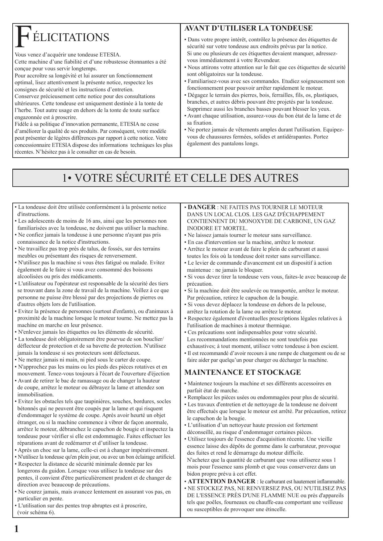 élicitations Vous venez d’acquérir une tondeuse ETESIA. Cette machine d’une fiabilité et d’une robustesse étonnantes a été conçue pour vous servir longtemps. Pour accroître sa longévité et lui assurer un fonctionnement optimal, lisez attentivement la présente notice, respectez les consignes de sécurité et les instructions d’entretien. Conservez précieusement cette notice pour des consultations ultérieures. Cette tondeuse est uniquement destinée à la tonte de l’herbe. Tout autre usage en dehors de la tonte de toute surface engazonnée est à proscrire. Fidèle à sa politique d’innovation permanente, ETESIA ne cesse d’améliorer la qualité de ses produits. Par conséquent, votre modèle peut présenter de légères différences par rapport à cette notice. Votre concessionnaire ETESIA dispose des informations techniques les plus récentes. N’hésitez pas à le consulter en cas de besoin. Avant d’utiliser la tondeuse