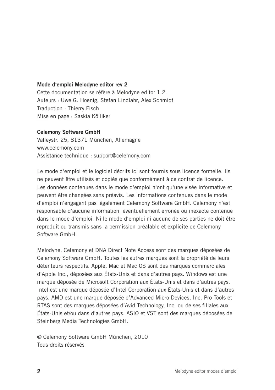 Mode d‘emploi Melodyne editor rev 2 Cette documentation se réfère à Melodyne editor 1.2. Auteurs : Uwe G. Hoenig, Stefan Lindlahr, Alex Schmidt Traduction : Thierry Fisch Mise en page : Saskia Kölliker Celemony Software GmbH Valleystr. 25, 81371 München, Allemagne www.celemony.com Assistance technique : support@celemony.com Le mode d‘emploi et le logiciel décrits ici sont fournis sous licence formelle. Ils ne peuvent être utilisés et copiés que conformément à ce contrat de licence. Les données contenues dans le mode d‘emploi n‘ont qu‘une visée informative et peuvent être changées sans préavis. Les informations contenues dans le mode d‘emploi n‘engagent pas légalement Celemony Software GmbH. Celemony n‘est responsable d‘aucune information éventuellement erronée ou inexacte contenue dans le mode d‘emploi. Ni le mode d‘emploi ni aucune de ses parties ne doit être reproduit ou transmis sans la permission préalable et explicite de Celemony Software GmbH. Melodyne, Celemony et DNA Direct Note Access sont des marques déposées de Celemony Software GmbH. Toutes les autres marques sont la propriété de leurs détenteurs respectifs. Apple, Mac et Mac OS sont des marques commerciales d’Apple Inc., déposées aux États-Unis et dans d’autres pays. Windows est une marque déposée de Microsoft Corporation aux États-Unis et dans d’autres pays. Intel est une marque déposée d’Intel Corporation aux États-Unis et dans d’autres pays. AMD est une marque déposée d’Advanced Micro Devices, Inc. Pro Tools et RTAS sont des marques déposées d’Avid Technology, Inc. ou de ses filiales aux États-Unis et/ou dans d’autres pays. ASIO et VST sont des marques déposées de Steinberg Media Technologies GmbH. © Celemony Software GmbH München, 2010 Tous droits réservés