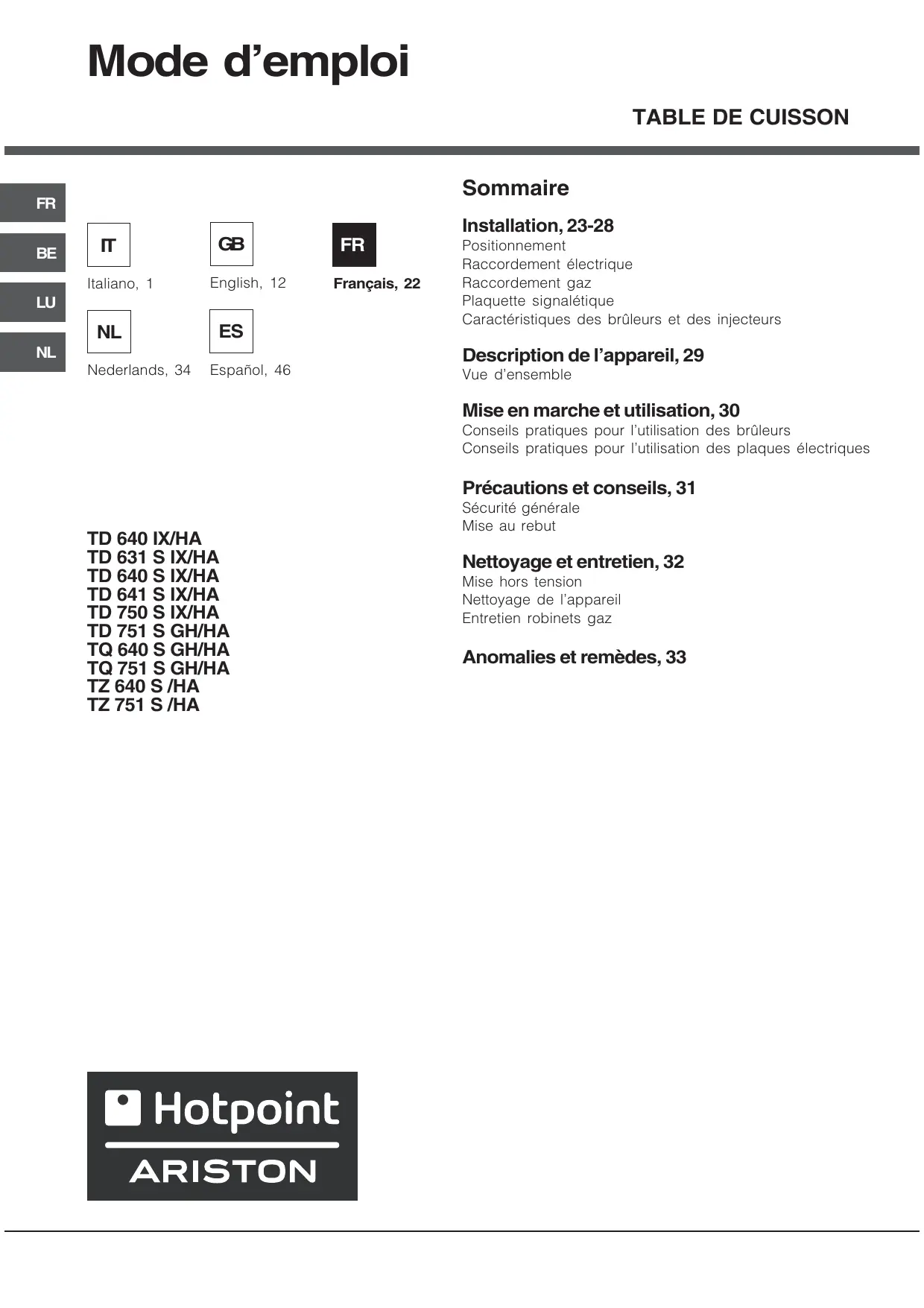 MODE D'EMPLOI TD 640 S ICE HOTPOINT