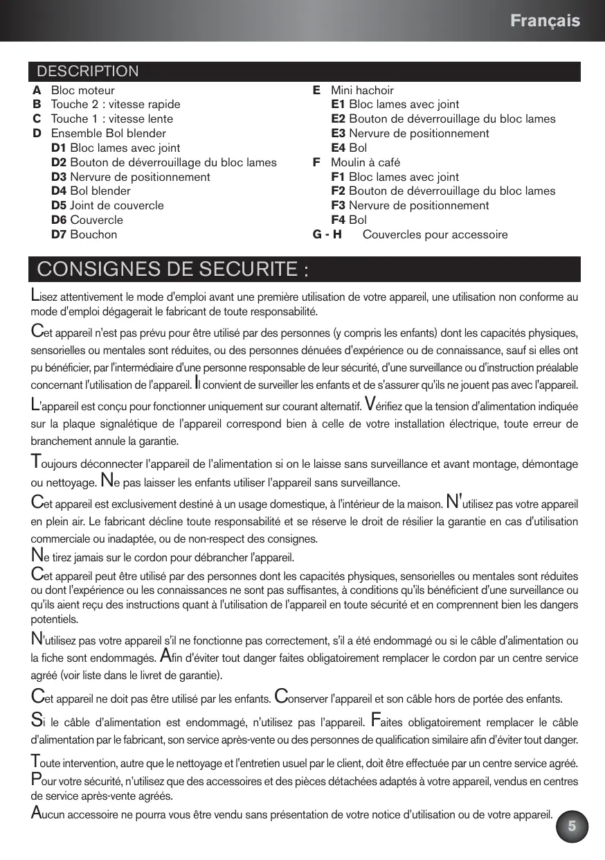 Bloc moteur Touche 2 : vitesse rapide Touche 1 : vitesse lente Ensemble Bol blender D1 Bloc lames avec joint D2 Bouton de déverrouillage du bloc lames D3 Nervure de positionnement D4 Bol blender D5 Joint de couvercle D6 Couvercle D7 Bouchon E Mini hachoir E1 Bloc lames avec joint E2 Bouton de déverrouillage du bloc lames E3 Nervure de positionnement E4 Bol F Moulin à café F1 Bloc lames avec joint F2 Bouton de déverrouillage du bloc lames F3 Nervure de positionnement F4 Bol G-H Couvercles pour accessoire CONSIGNES DE SECURITE : Lisez attentivement le mode d'emploi avant une première utilisation de votre appareil, une utilisation non conforme au mode d'emploi dégagerait le fabricant de toute responsabilité. Cet appareil n'est pas prévu pour être utilisé par des personnes (y compris les enfants) dont les capacités physiques, sensorielles ou mentales sont réduites, ou des personnes dénuées d'expérience ou de connaissance, sauf si elles ont pu bénéficier, par l'intermédiaire d'une personne responsable de leur sécurité, d'une surveillance ou d'instruction préalable concernant l'utilisation de l'appareil. l convient de surveiller les enfants et de s'assurer qu'ils ne jouent pas avec l'appareil.