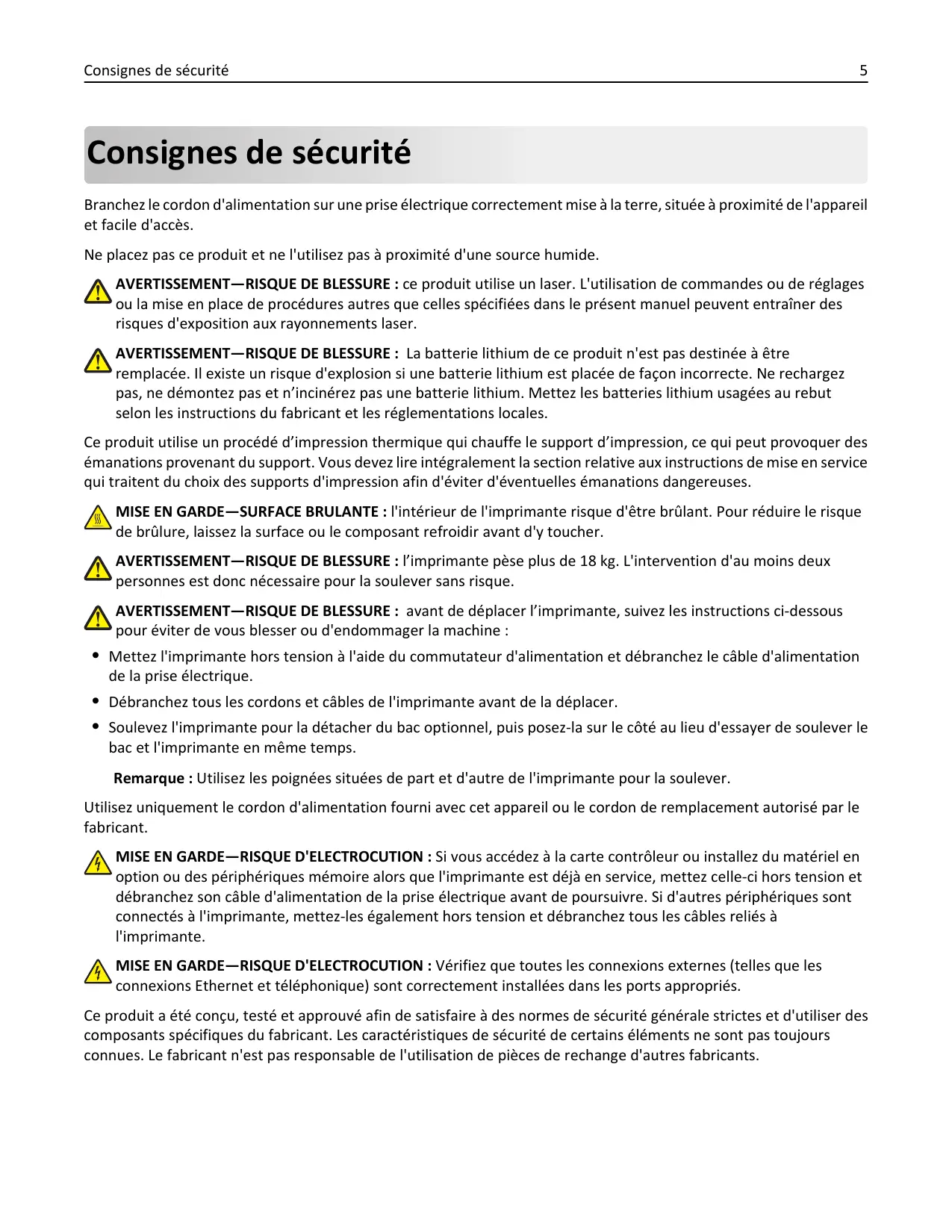 Consignes de sécurité Branchez le cordon d'alimentation sur une prise électrique correctement mise à la terre, située à proximité de l'appareil et facile d'accès. Ne placez pas ce produit et ne l'utilisez pas à proximité d'une source humide. AVERTISSEMENT—RISQUE DE BLESSURE : ce produit utilise un laser. L'utilisation de commandes ou de réglages ou la mise en place de procédures autres que celles spécifiées dans le présent manuel peuvent entraîner des risques d'exposition aux rayonnements laser. AVERTISSEMENT—RISQUE DE BLESSURE : La batterie lithium de ce produit n'est pas destinée à être remplacée. Il existe un risque d'explosion si une batterie lithium est placée de façon incorrecte. Ne rechargez pas, ne démontez pas et n’incinérez pas une batterie lithium. Mettez les batteries lithium usagées au rebut selon les instructions du fabricant et les réglementations locales. Ce produit utilise un procédé d’impression thermique qui chauffe le support d’impression, ce qui peut provoquer des émanations provenant du support. Vous devez lire intégralement la section relative aux instructions de mise en service qui traitent du choix des supports d'impression afin d'éviter d'éventuelles émanations dangereuses. MISE EN GARDE—SURFACE BRULANTE : l'intérieur de l'imprimante risque d'être brûlant. Pour réduire le risque de brûlure, laissez la surface ou le composant refroidir avant d'y toucher. AVERTISSEMENT—RISQUE DE BLESSURE : l’imprimante pèse plus de 18 kg. L'intervention d'au moins deux personnes est donc nécessaire pour la soulever sans risque. AVERTISSEMENT—RISQUE DE BLESSURE : avant de déplacer l’imprimante, suivez les instructions ci-dessous pour éviter de vous blesser ou d'endommager la machine :