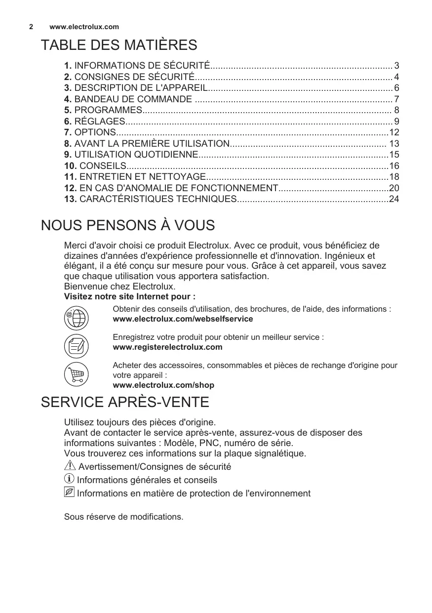 Merci d'avoir choisi ce produit Electrolux. Avec ce produit, vous bénéficiez de dizaines d'années d'expérience professionnelle et d'innovation. Ingénieux et élégant, il a été conçu sur mesure pour vous. Grâce à cet appareil, vous savez que chaque utilisation vous apportera satisfaction. Bienvenue chez Electrolux. Visitez notre site Internet pour : Obtenir des conseils d'utilisation, des brochures, de l'aide, des informations : www.electrolux.com/webselfservice Enregistrez votre produit pour obtenir un meilleur service : www.registerelectrolux.com Acheter des accessoires, consommables et pièces de rechange d'origine pour votre appareil : www.electrolux.com/shop