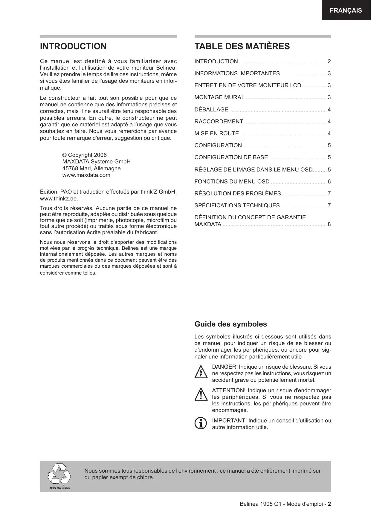 Ce manuel est destiné à vous familiariser avec l'installation et l'utilisation de votre monitreur Belinea. Veuillez prendre le temps de direc ces instructions, même si vous etes familier de I'usage des moniteurs en informatique.