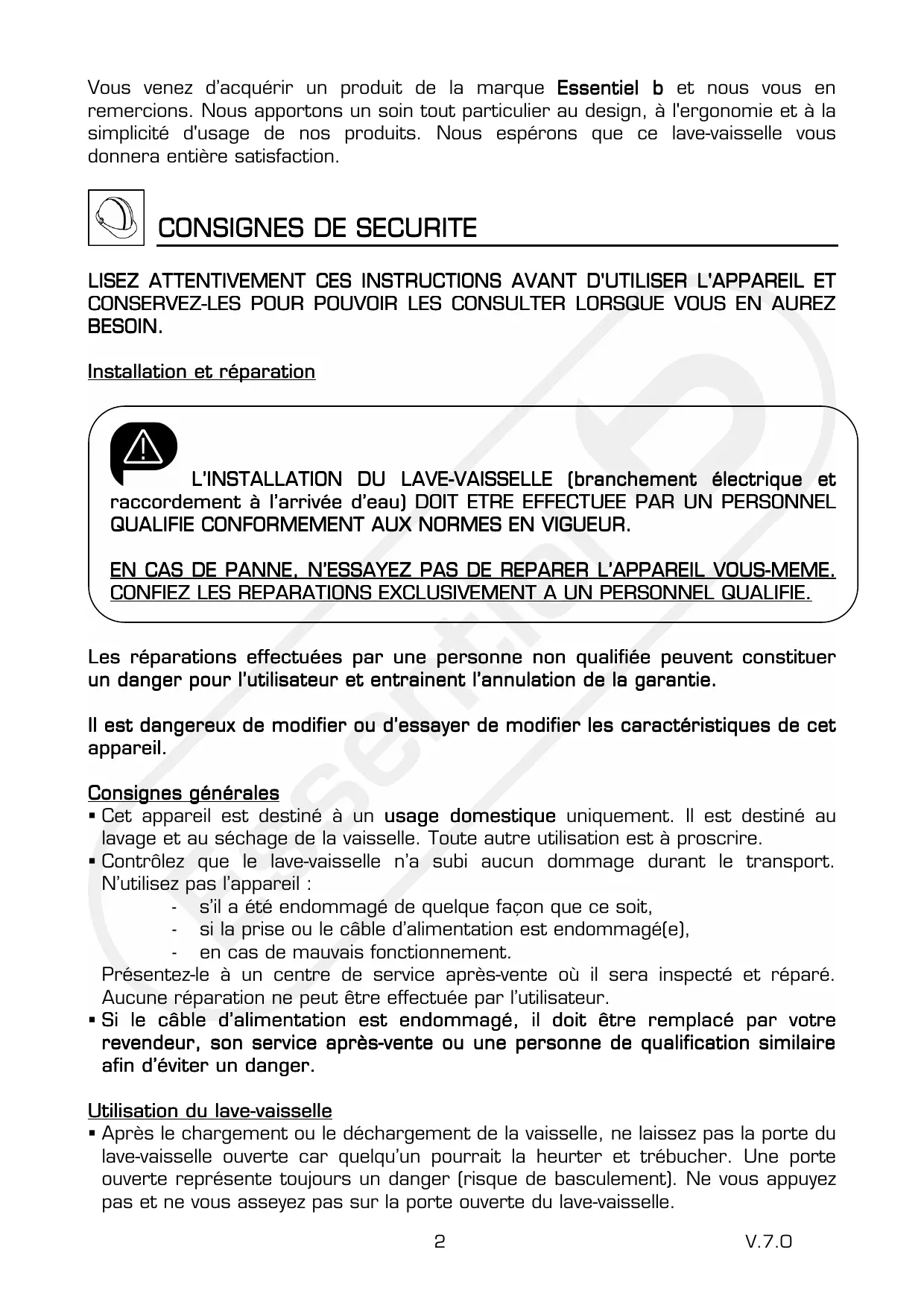 Codes erreur....................................................................................31 Vous venez d’acquérir un produit de la marque Essentiel b et nous vous en remercions. Nous apportons un soin tout particulier au design, à l'ergonomie et à la simplicité d'usage de nos produits. Nous espérons que ce lave-vaisselle vous donnera entière satisfaction.