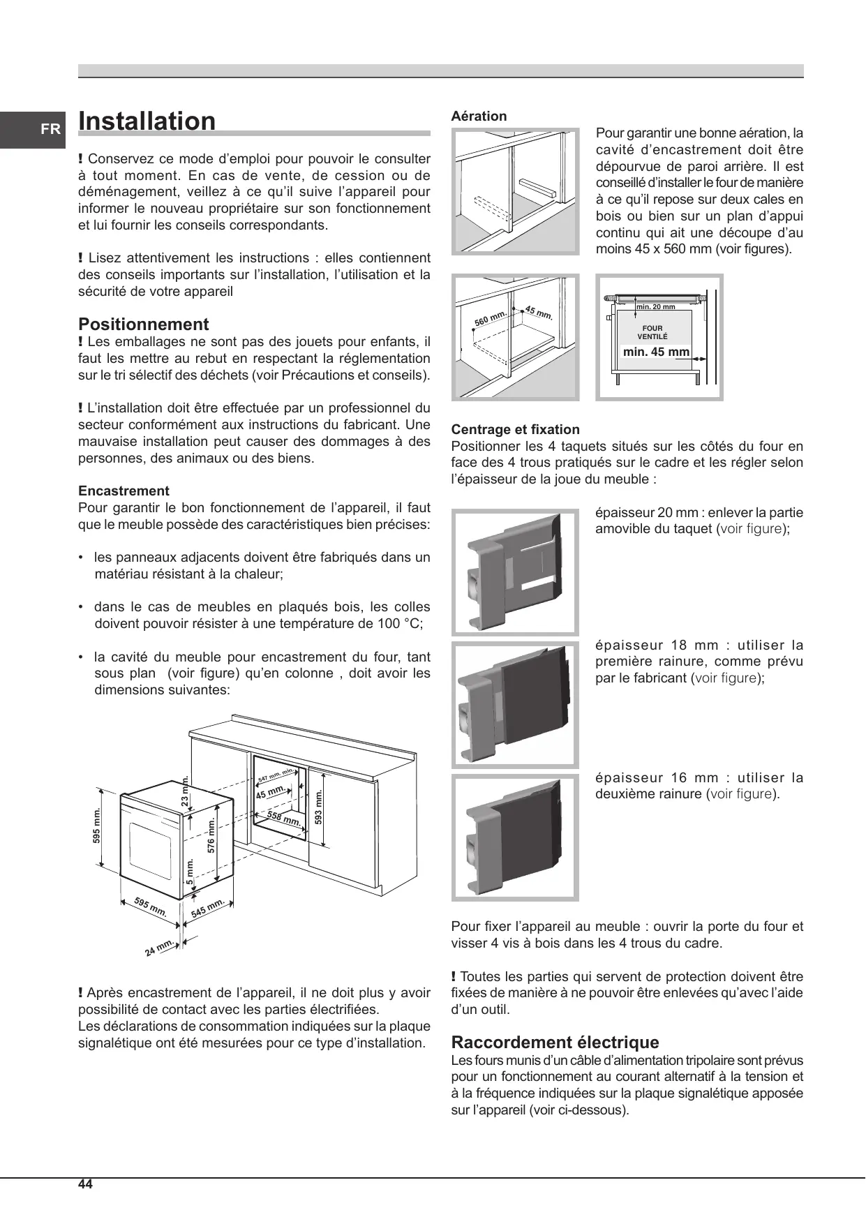 Installation Aération Pour garantir une bonne aération, la cavité d’encastrement doit être dépourvue de paroi arrière. Il est conseillé d’installer le four de manière à ce qu’il repose sur deux cales en bois ou bien sur un plan d’appui continu qui ait une découpe d’au moins 45 x 560 mm (voir figures). ! Conservez ce mode d’emploi pour pouvoir le consulter à tout moment. En cas de vente, de cession ou de déménagement, veillez à ce qu’il suive l’appareil pour informer le nouveau propriétaire sur son fonctionnement et lui fournir les conseils correspondants. ! Lisez attentivement les instructions : elles contiennent des conseils importants sur l’installation, l’utilisation et la sécurité de votre appareil Positionnement
