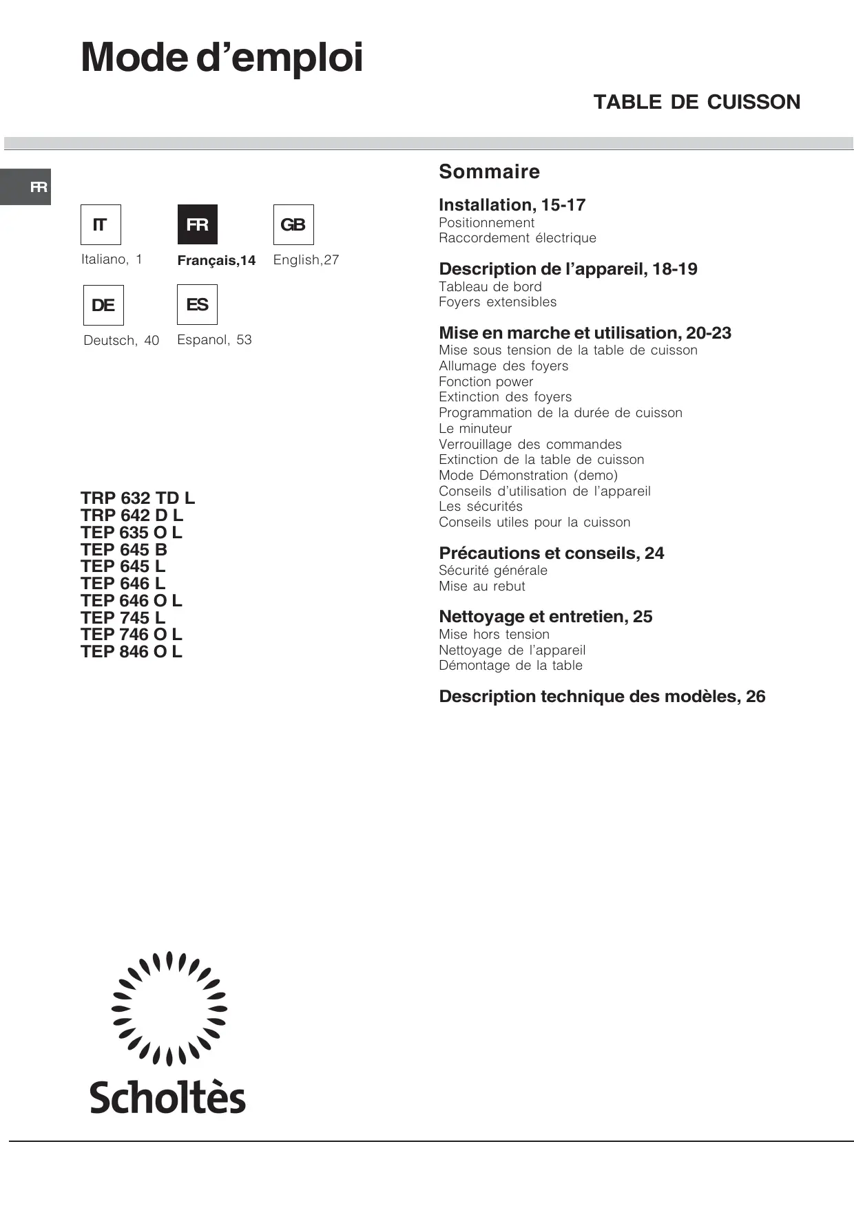 TRP 642 DL - Plaque de cuisson SCHOLTES - Notice d'utilisation et mode d'emploi gratuit