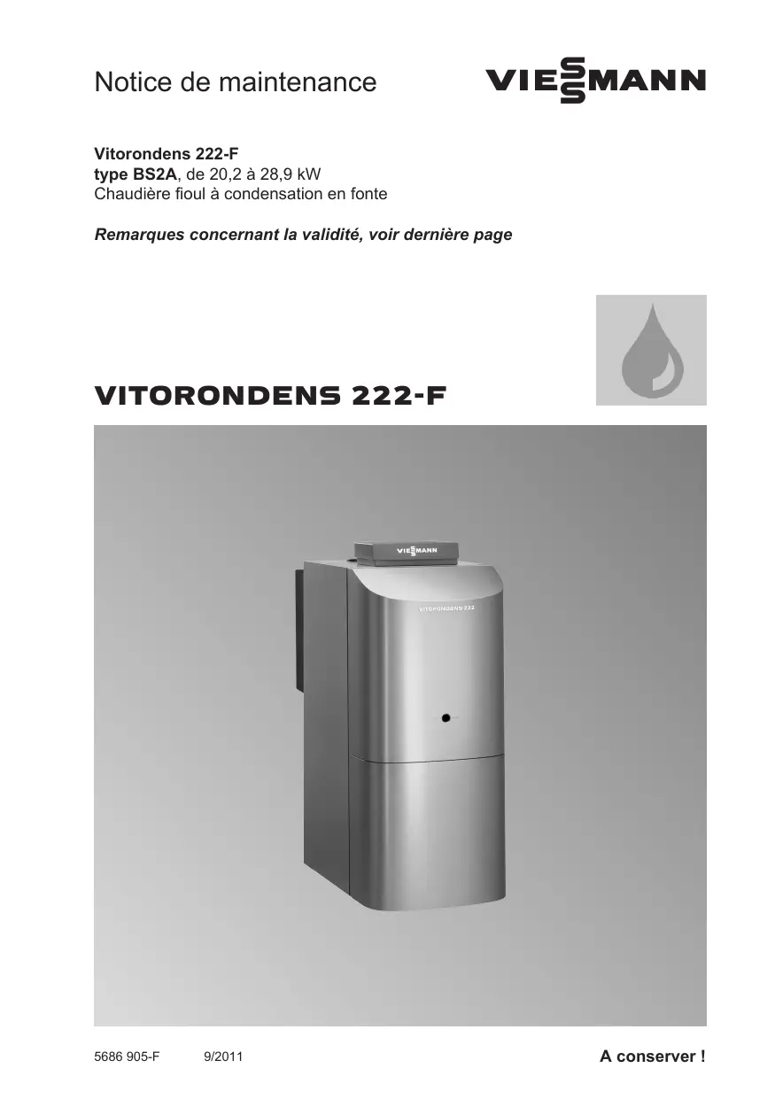 Notice de maintenance VIESMANN Vitorondens 222-F type BS2A, de 20,2 à 28,9 kW Chaudière fioul à condensation en fonte Remarques concernant la validité, voir dernière page VITORONDENS 222-F 5686 905-F 9/2011 A conserver ! Consignes de sécurité Consignes de sécurité Respecter scrupuleusement ces consignes de sécurité afin d'éviter tout risque et tout dommage pour les personnes et les biens. Explication des consignes de sécurité