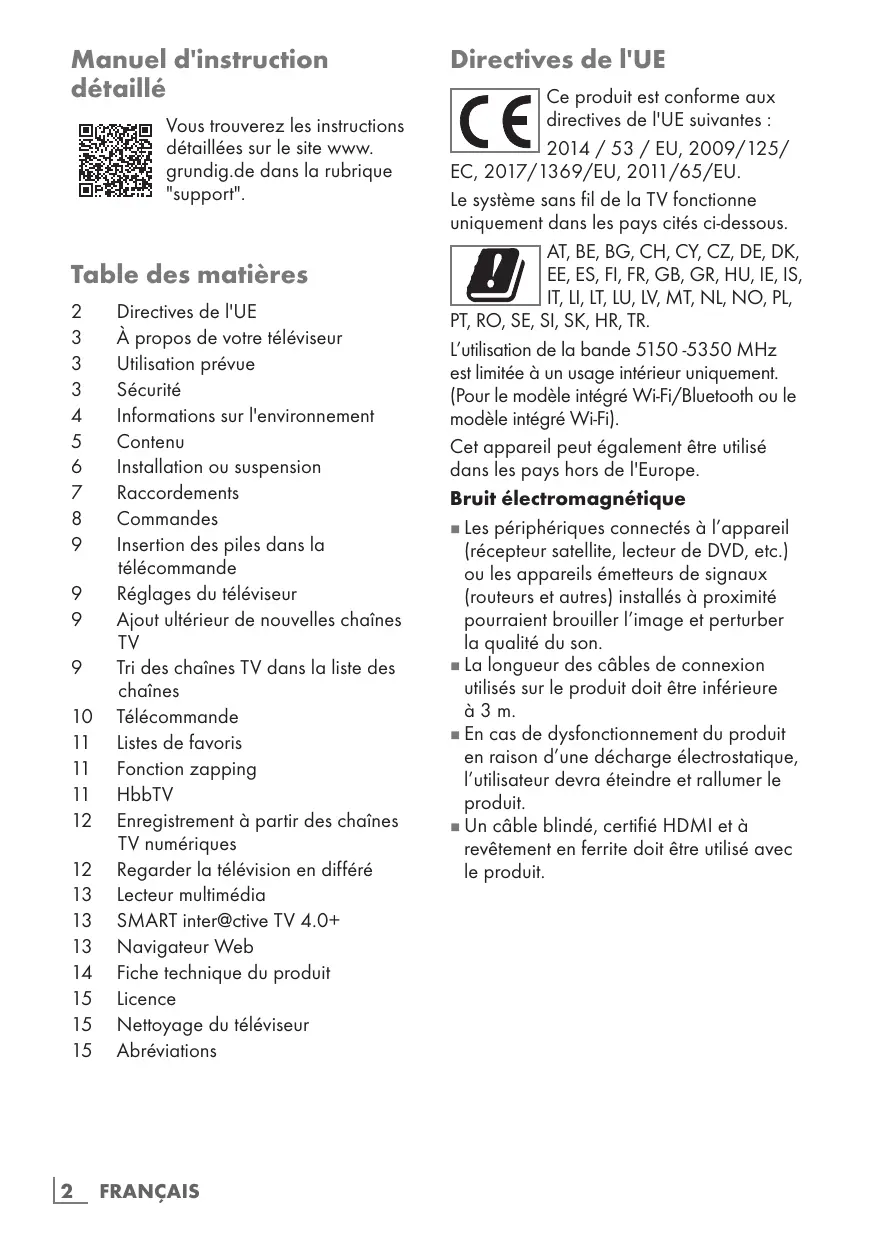 Directives de l'UE À propos de votre téléviseur Utilisation prévue Sécurité Informations sur l'environnement Contenu Installation ou suspension Raccordements Commandes Insertion des piles dans la télécommande Réglages du téléviseur Ajout ultérieur de nouvelles chaînes TV Tri des chaînes TV dans la liste des chaînes Télécommande Listes de favoris Fonction zapping HbbTV Enregistrement à partir des chaînes TV numériques Regarder la télévision en différé Lecteur multimédia SMART inter@ctive TV 4.0+ Navigateur Web Fiche technique du produit Licence Nettoyage du téléviseur Abréviations