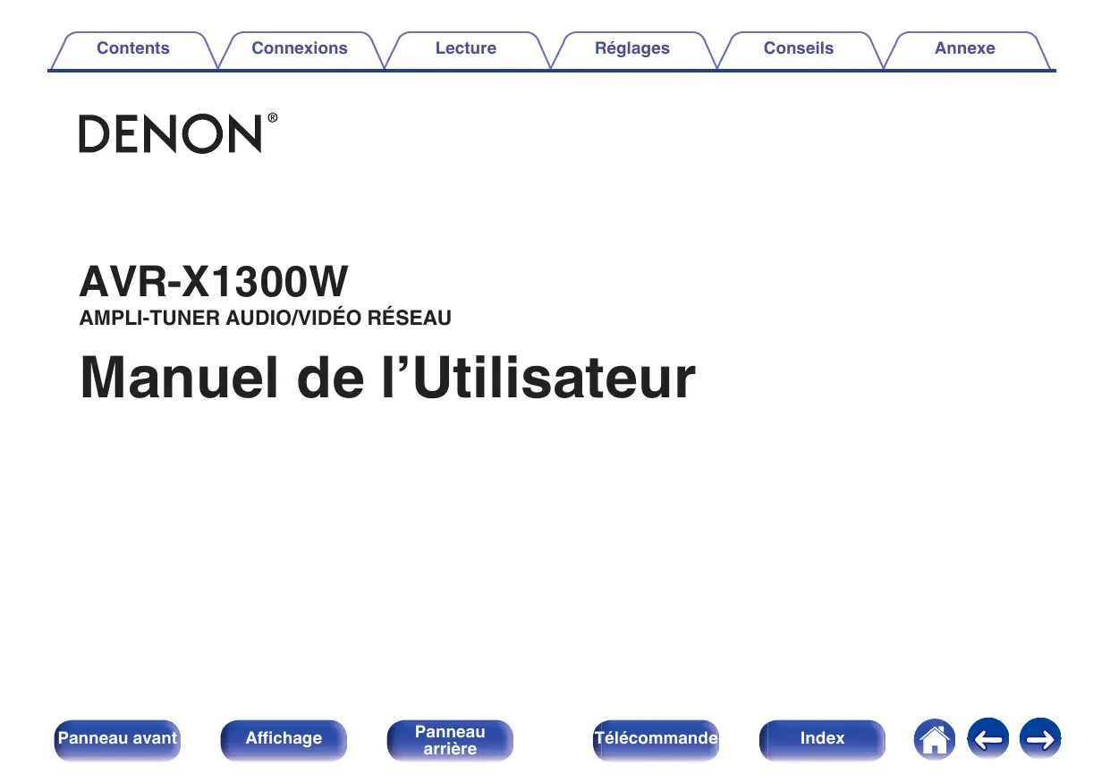 Téléchargez la notice de votre Récepteur A/V au format PDF gratuitement ! Retrouvez votre notice AVRX1300 - DENON et reprennez votre appareil électronique en main. Sur cette page sont publiés tous les documents nécessaires à l'utilisation de votre appareil AVRX1300 de la marque DENON.