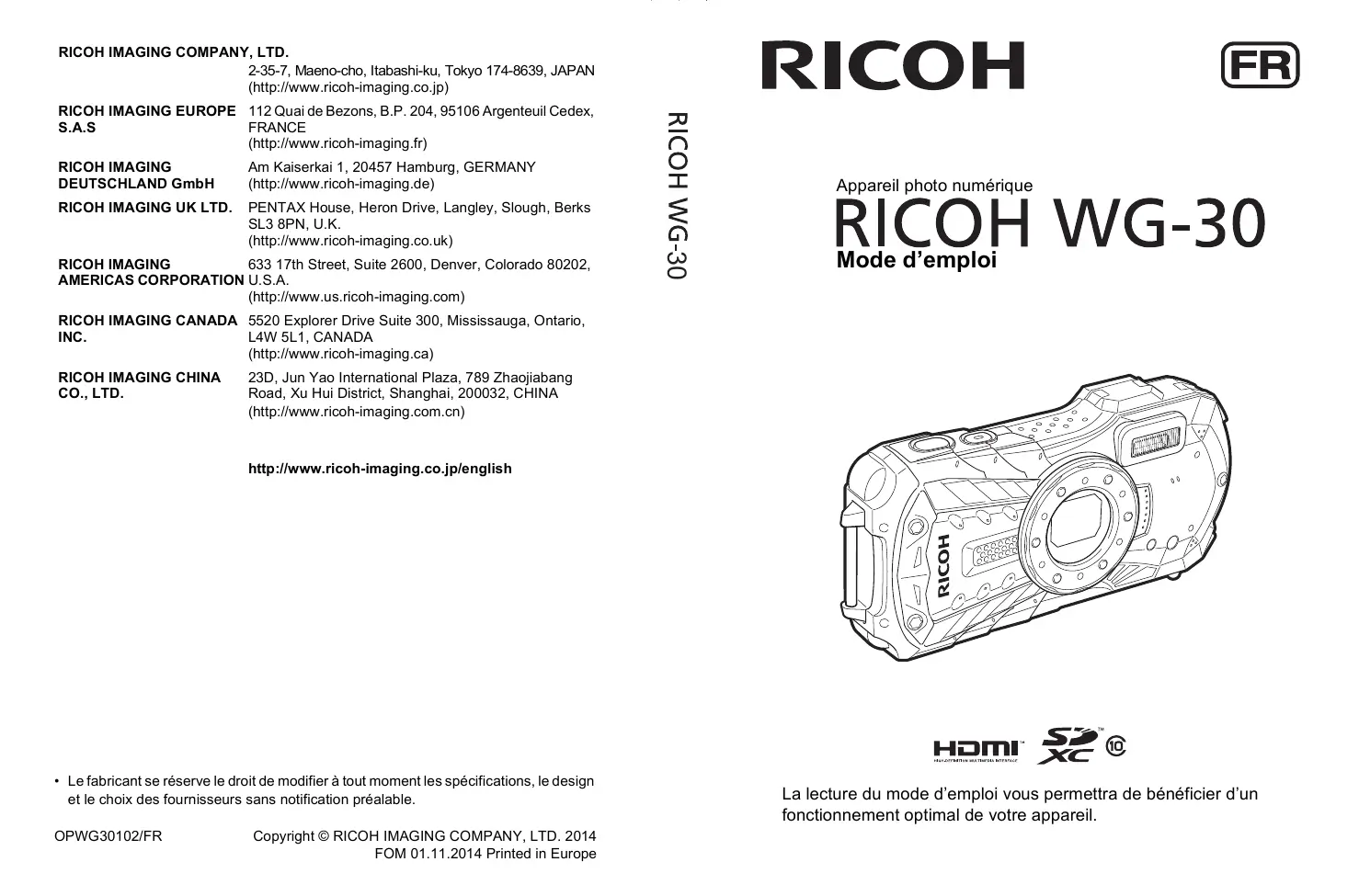 Numéro de modèle : RICOH WG-30 Contact : responsable service clientèle : Date et lieu : octobre 2014, Colorado ë