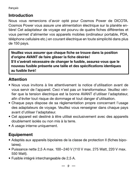Nous vous remercions d'avoir opté pour Cosmos Power de DICOTA. Cosmos Power vous assure une alimentation électrique sur la planete entière! Cet adaptateur de voyage est pourvu de quatre fiches différentes et vous permet d'alimenter vos apparueils mobiles (ordinateur portable, PDA, téléphone cellulaire etc.) en courant électrique en toute simplicité dans plus de 150 pays.