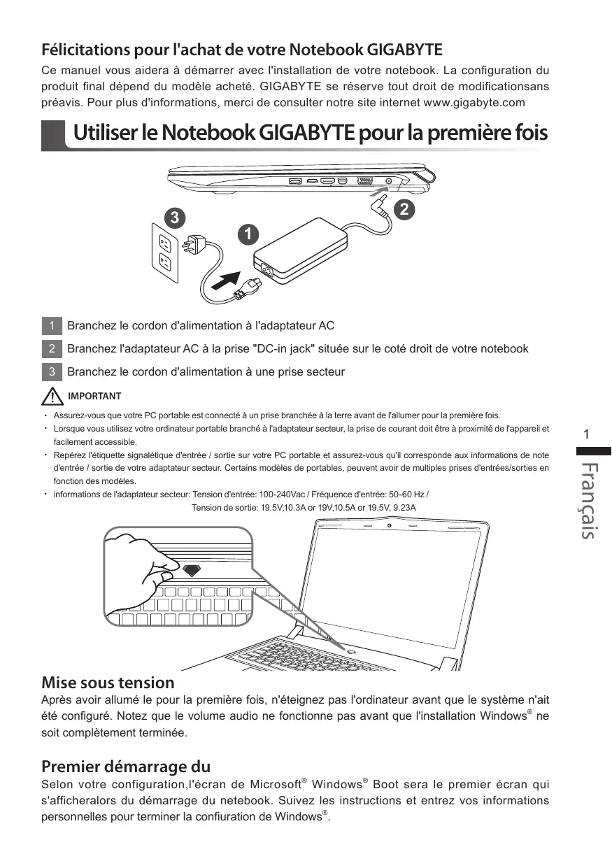 Félicitations pour l'achat de votre Notebook GIGABYTE Ce manuel vous aidera à démarrer avec l'installation de votre notebook. La configuration du produit final dépend du modèle acheté. GIGABYTE se réserve tout droit de modificationsans préavis. Pour plus d'informations, merci de consulter notre site internet www.gigabyte.com