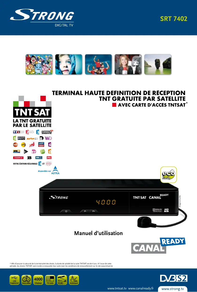 TOUTES FORMES D’UTILISATION DE CE PRODUIT AUTRES QUE PERSONNELLE QUI REPOND AU STANDARD MPEG-2 POUR ENCODAGE DE L’INFORMATION POUR LES PAQUETS MEDIA SONT FORMELLEMENT INTERDITES SANS UNE LICENSE D’EXPLOITATION DU BREVET APPARTENANT AU PORTEFEUILLE DU BREVET MPEG-2, LICENSE DISPONIBLE AUPRES DE MPEG LA, LLC, 6312 S. Fiddlers Green Circle, Suite 400E, Greenwood Village, Colorado 80111 U.S.A. CE PRODUIT EST SOUS LICENCE DU PORTEFEUILLE DE BREVETS AVC. CE PRODUIT EST STRICTEMENT RESERVE A UN USAGE PARTICULIER, PRIVE ET NON COMMERCIAL POUR (i) ENCODER DE LA VIDÉO EN CONFORMITÉ AVEC LA NORME AVC («VIDÉO AVC») ET/OU (ii) DÉCODER DE LA VIDÉO AVC QUI A ETE CODEE PAR UN UTILISATEUR PARTICULIER DANS UNE ACTIVITÉ PERSONNELLE PRIVEE ET NON COMMERCIALE ET / OU OBTENUES D’UN FOURNISSEUR VIDÉO SOUS LICENCE POUR FOURNIR DES VIDEOS AVC. AUCUNE LICENCE N’EST ACCORDÉE OU TACITE POUR TOUTE AUTRE UTILISATION. DES INFORMATIONS COMPLÉMENTAIRES PEUVENT ÊTRE OBTENUES DE MPEG LA, LLC SUR HTTP://WWW.MPEGLA.COM © STRONG 2013. Tous droits réservés. La durée de validité de la carte TNTSAT est de 4 ans. Voir conditions de renouvellement au terme de ces 4 ans sur le site www.tntsat.tv Utilisation d’un décodeur et d’une carte TNTSAT exclusivement limitée au Territoire Français Métropolitain et Monaco, au profit de personnes physiques, pour un usage privé et personnel. www.tntsat.tv www.canalready.fr www.strong.tv