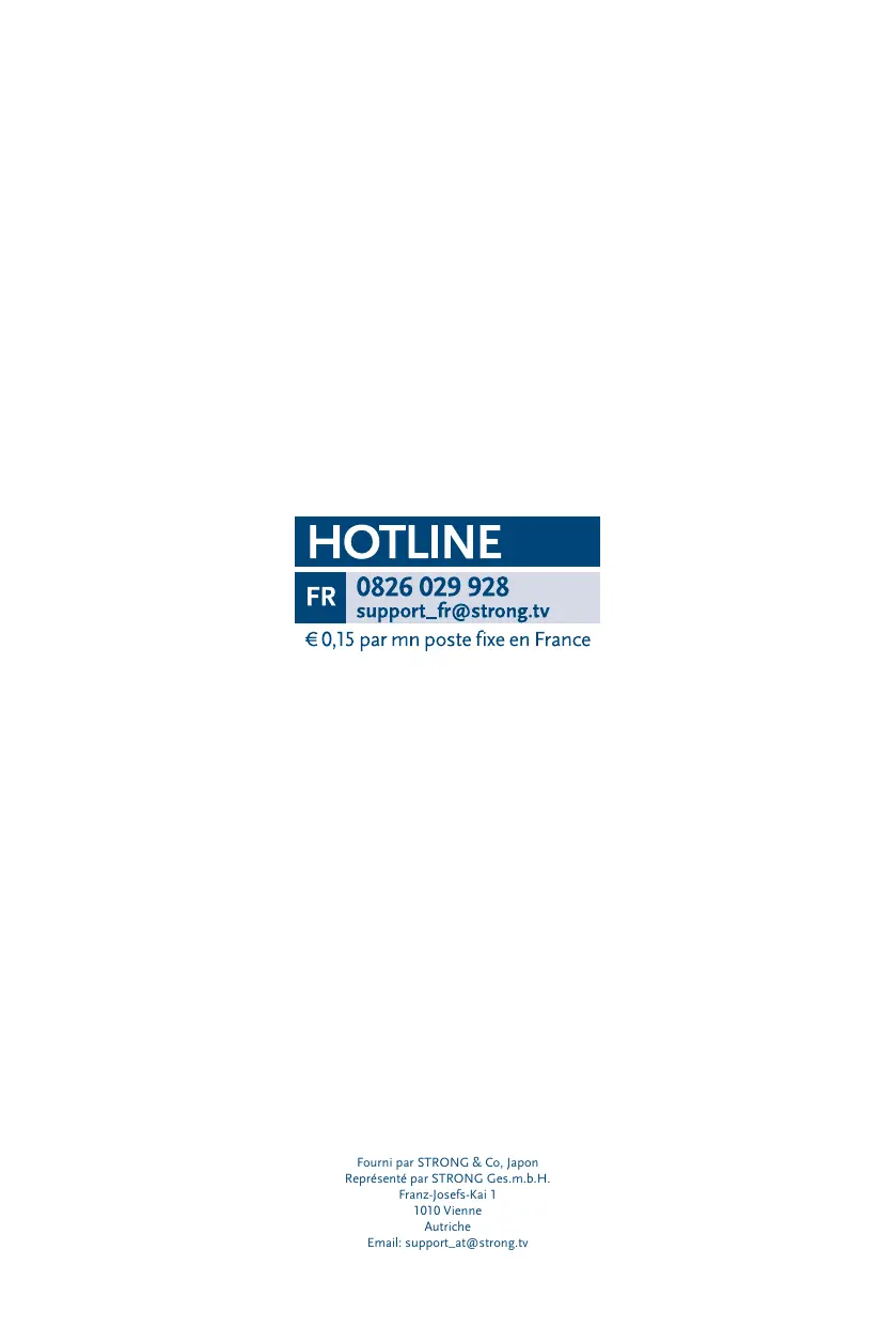 16 Oct 2015 16:29 STRONG déclare que ce point est conforme aux exigences de base et aux autres dispositions et directives applicables 2004/108/EC et 73/23/EC, RoHS 2002/95/EC Sujet à modification. En conséquence de la recherche et du développement continu, les spécificités techniques, le design et l’apparence du produit peuvent changer. HDMI, le logo HDMI et « High-Definition Multimedia Interface » sont des marques ou des marques enregistrées appartenant à HDMI Licensing LLC aux Etats Unis et dans les autres pays. Fabriqué sous licence de Dolby Laboratories. Dolby et le symbole double-D sont des marques déposées de Dolby Laboratories. FRANSAT est une marque de Fransat Télévision Numérique, Eutelsat et HOT BIRD sont marques de Eutelsat Communications, Viaccess est une marque de Viaccess, tous les autres produits sont des marques ou des marques déposées de leurs propriétaires respectifs. © STRONG 2015. Tous droits réservés.