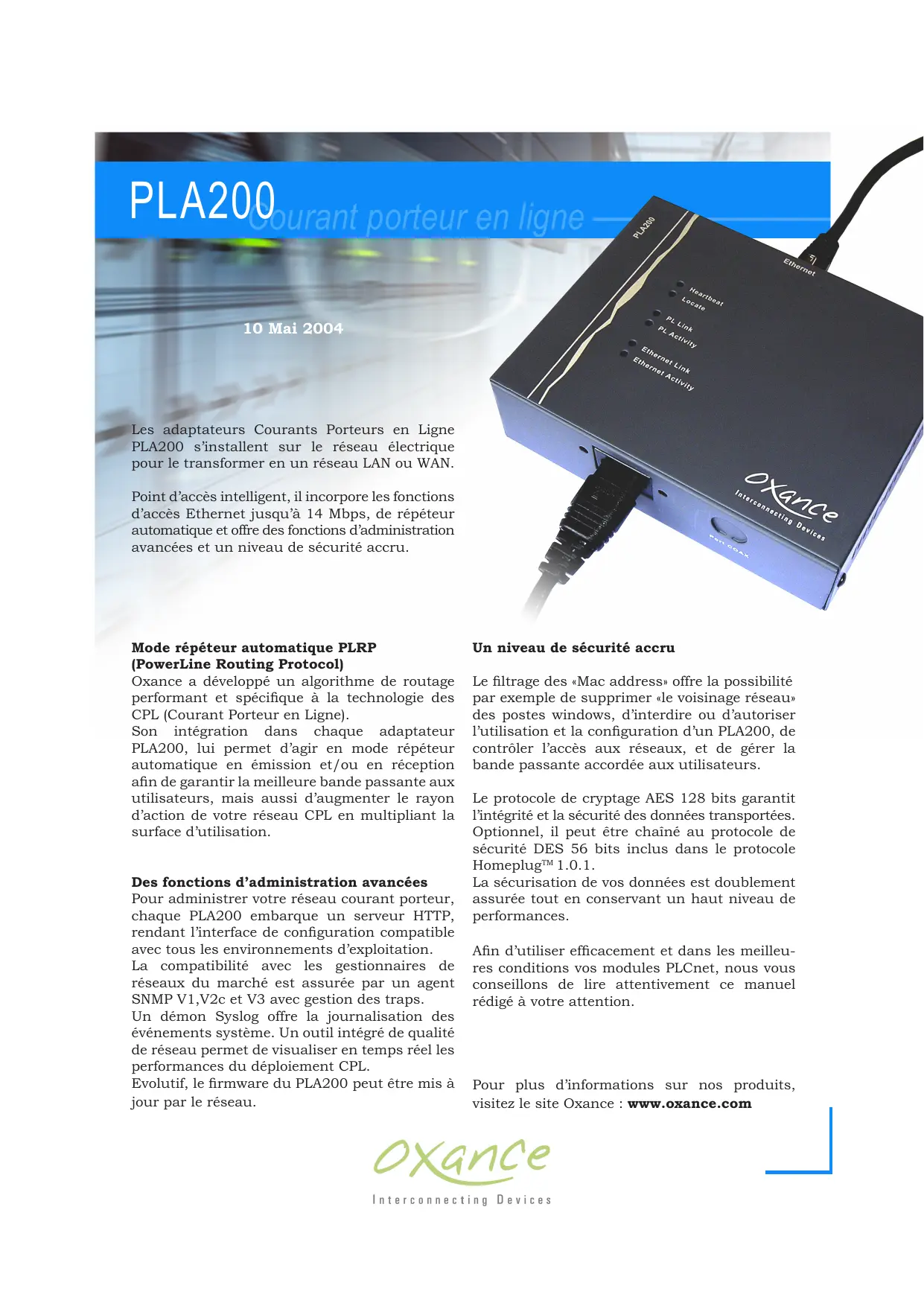 PLA200 Courant porteur en ligne 10 Mai 2004 Les adaptateurs Courants Porteurs en Ligne PLA200 s’installent sur le réseau électrique pour le transformer en un réseau LAN ou WAN. Point d’accès intelligent, il incorpore les fonctions d’accès Ethernet jusqu’à 14 Mbps, de répéteur automatique et offre des fonctions d’administration avancées et un niveau de sécurité accru. Mode répéteur automatique PLRP (PowerLine Routing Protocol) Oxance a développé un algorithme de routage performant et spécique à la technologie des CPL (Courant Porteur en Ligne). Son intégration dans chaque adaptateur PLA200, lui permet d’agir en mode répéteur automatique en émission et/ou en réception an de garantir la meilleure bande passante aux utilisateurs, mais aussi d’augmenter le rayon d’action de votre réseau CPL en multipliant la surface d’utilisation. Des fonctions d’administration avancées Pour administrer votre réseau courant porteur, chaque PLA200 embarque un serveur HTTP, rendant l’interface de conguration compatible avec tous les environnements d’exploitation. La compatibilité avec les gestionnaires de réseaux du marché est assurée par un agent SNMP V1,V2c et V3 avec gestion des traps. Un démon Syslog offre la journalisation des événements système. Un outil intégré de qualité de réseau permet de visualiser en temps réel les performances du déploiement CPL. Evolutif, le rmware du PLA200 peut être mis à jour par le réseau. Un niveau de sécurité accru Le ltrage des «Mac address» offre la possibilité par exemple de supprimer «le voisinage réseau» des postes windows, d’interdire ou d’autoriser l’utilisation et la conguration d’un PLA200, de contrôler l’accès aux réseaux, et de gérer la bande passante accordée aux utilisateurs. Le protocole de cryptage AES 128 bits garantit l’intégrité et la sécurité des données transportées. Optionnel, il peut être chaîné au protocole de sécurité DES 56 bits inclus dans le protocole HomeplugTM 1.0.1. La sécurisation de vos données est doublement assurée tout en conservant un haut niveau de performances. An d’utiliser efcacement et dans les meilleures conditions vos modules PLCnet, nous vous conseillons de lire attentivement ce manuel rédigé à votre attention. Pour plus d’informations sur nos produits, visitez le site Oxance : www.oxance.com