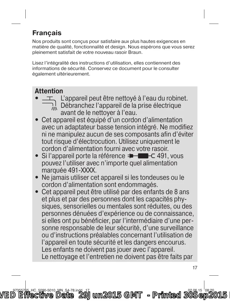 Français Nos produits sont conçus pour satisfaire aux plus hautes exigences en matière de qualité, fonctionnalité et design. Nous espérons que vous serez pleinement satisfait de votre nouveau rasoir Braun. Lisez l’intégralité des instructions d’utilisation, elles contiennent des informations de sécurité. Conservez ce document pour le consulter également ultérieurement. Attention L’appareil peut être nettoyé à l’eau du robinet. Débranchez l’appareil de la prise électrique avant de le nettoyer à l’eau.