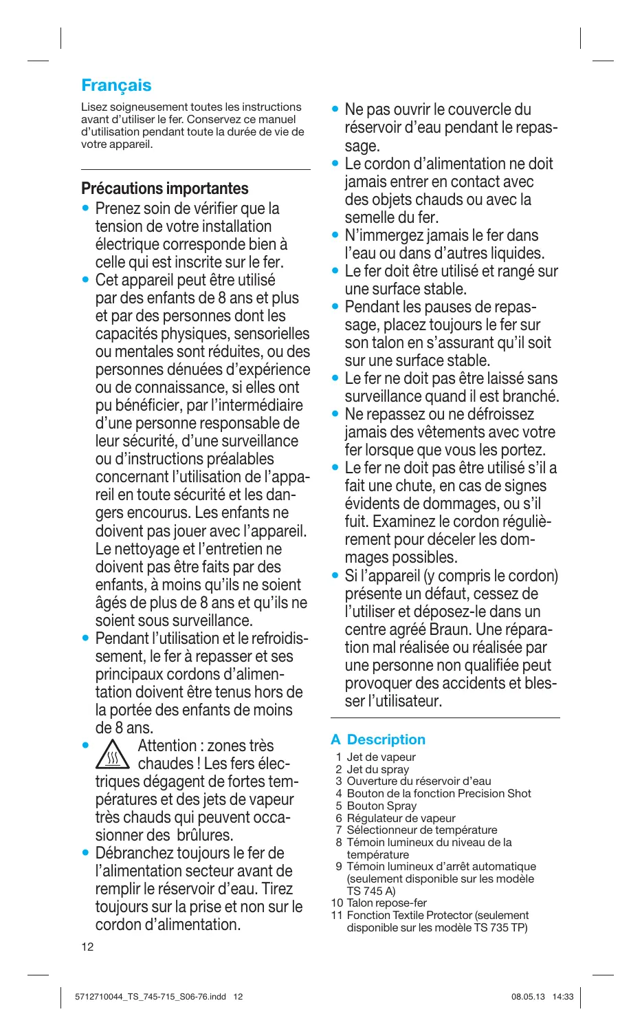 - Si l’appareil (y compris le cordon) présente un défaut, cessez de l’utiliser et déposez-le dans un centre agréé Braun. Une réparation mal réalisée ou réalisée par une personne non qualifiée peut provoquer des accidents et blesser l’utilisateur. A Description