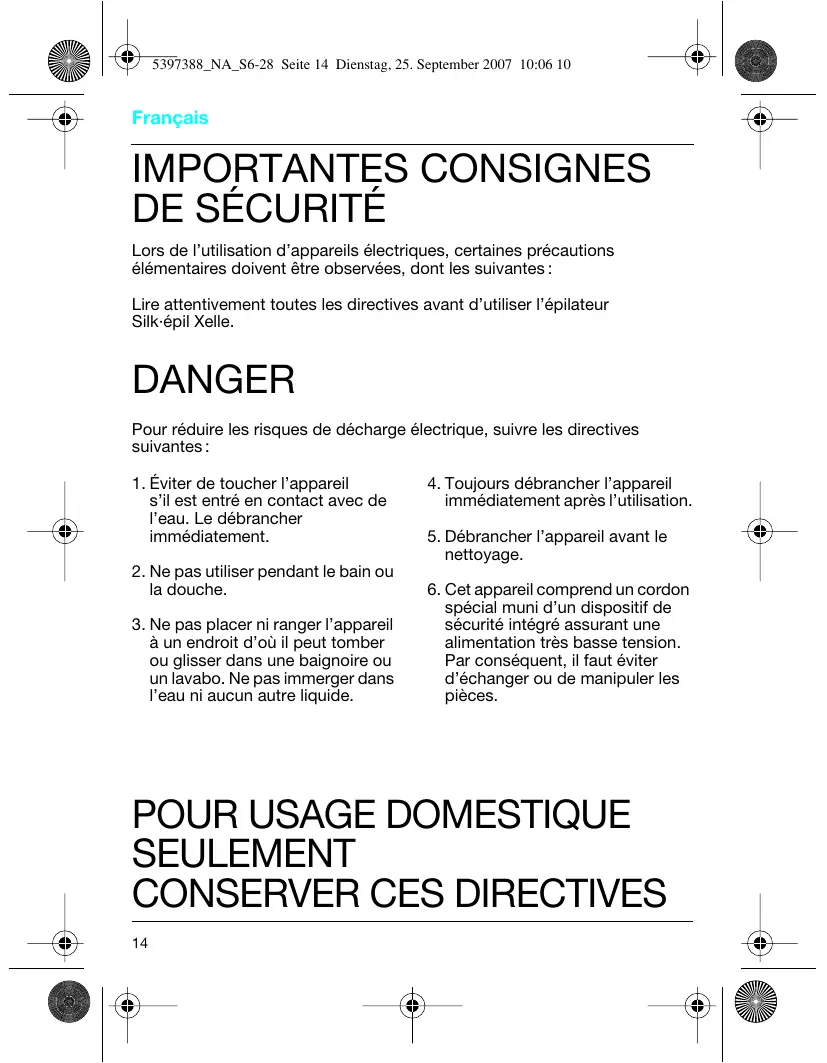 o © 5397388_NA_S6-28 Seite 14 Dienstag, 25. September 2007 10:06 10 œ 6 —{& Français &— Lors de l’utilisation d'appareils électriques, certaines précautions élémentaires doivent être observées, dont les suivantes : Lire attentivement toutes les directives avant d'utiliser l'épilateur Silk-épil Xelle. Pour réduire les risques de décharge électrique, suivre les directives suivantes :