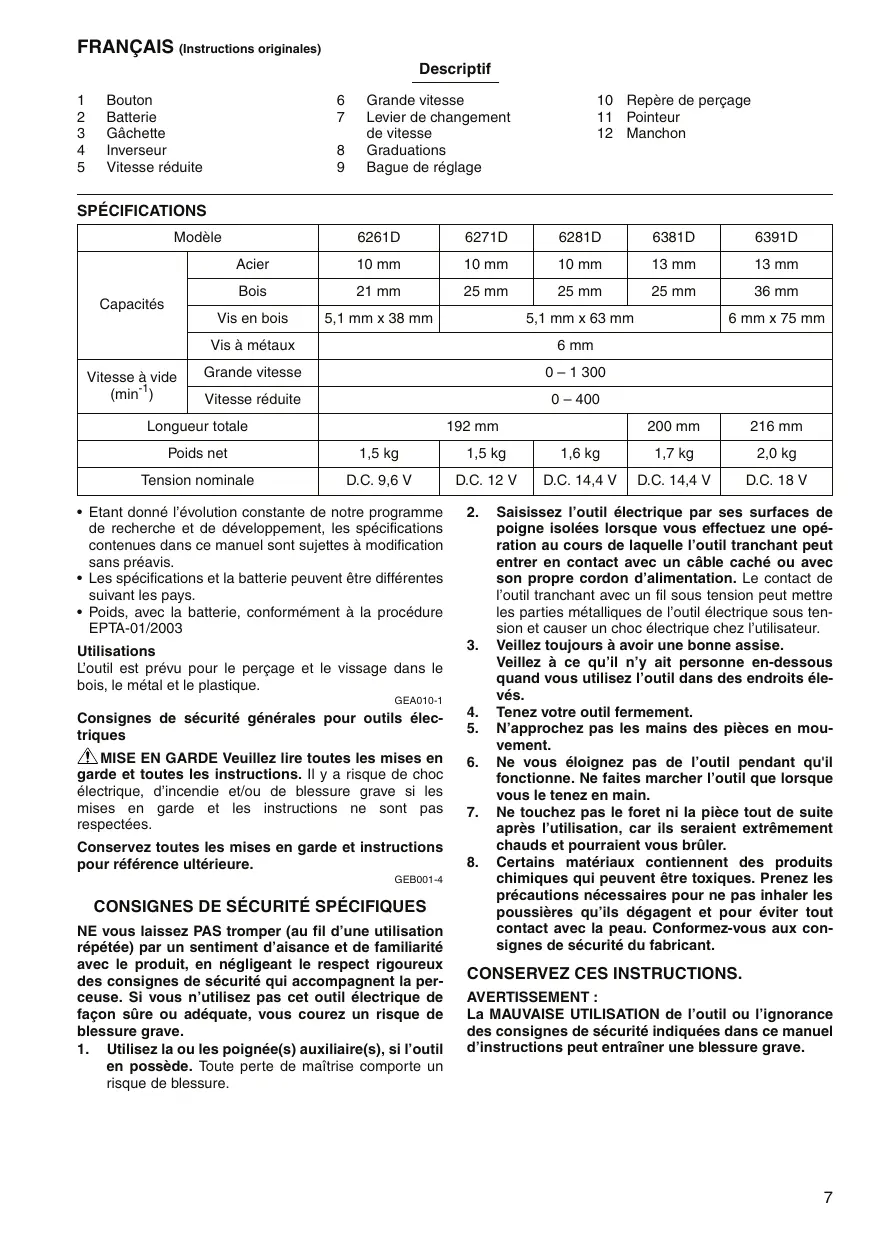Désignation de la machine : Perceuse-visseuse sans fil N° de modèle / Type : 6261D, 6271D, 6281D, 6381D, 6391D sont produites en série et sont conformes aux Directives européennes suivantes : 98/37/CE jusqu’au 28 décembre 2009, puis 2006/ 42/CE à compter du 29 décembre 2009 et qu’elles sont fabriquées conformément aux normes ou documents normalisés suivants : EN60745 La documentation technique est conservée par notre représentant agréé en Europe, à savoir : Makita International Europe Ltd. Michigan Drive, Tongwell, No deje la herramienta encendida. Póngala en marcha solamente cuando la tenga en las manos. No toque la broca ni la pieza de trabajo inmediatamente después de la operación; podrán estar muy calientes y quemarle la piel. Algunos materiales contienen sustancias químicas que podrán ser tóxicas. Tenga precaución para evitar la inhalación de polvo y el contacto con la piel. Siga los datos de seguridad del abastecedor del material.