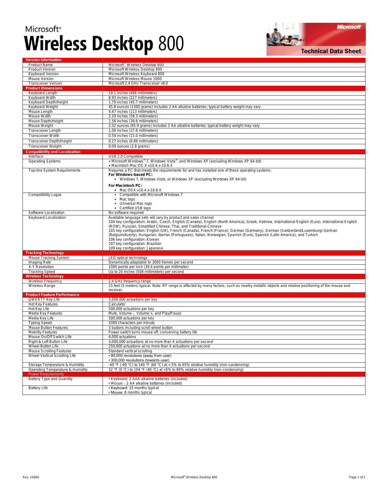 Retrouvez gratuitement la notice de l'appareil WIRELESS DESKTOP 800 MICROSOFT au format PDF.