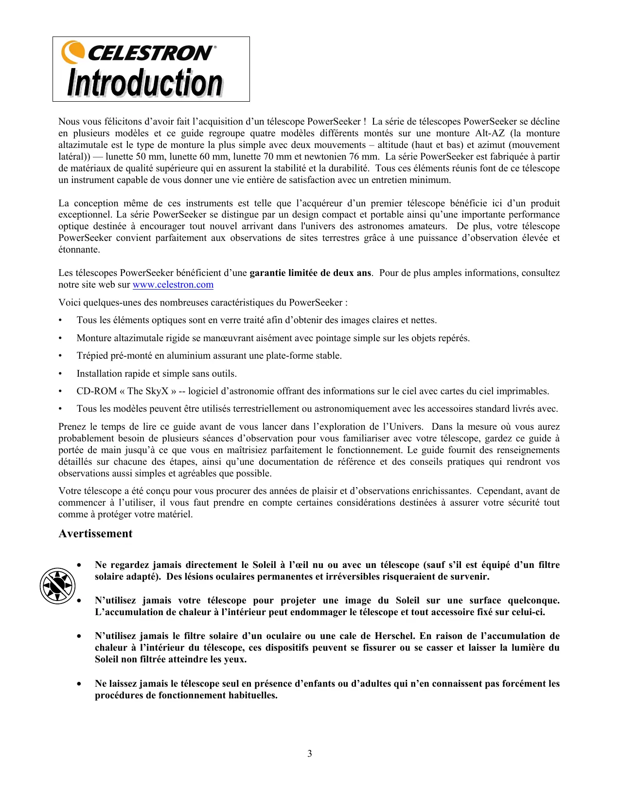 Nous vous félicitons d’avoir fait l’acquisition d’un télescope PowerSeeker ! La série de télescopes PowerSeeker se décline en plusieurs modèles et ce guide regroupe quatre modèles différents montés sur une monture Alt-AZ (la monture altazimutale est le type de monture la plus simple avec deux mouvements – altitude (haut et bas) et azimut (mouvement latéral)) — lunette 50 mm, lunette 60 mm, lunette 70 mm et newtonien 76 mm. La série PowerSeeker est fabriquée à partir de matériaux de qualité supérieure qui en assurent la stabilité et la durabilité. Tous ces éléments réunis font de ce télescope un instrument capable de vous donner une vie entière de satisfaction avec un entretien minimum. La conception même de ces instruments est telle que l’acquéreur d’un premier télescope bénéficie ici d’un produit exceptionnel. La série PowerSeeker se distingue par un design compact et portable ainsi qu’une importante performance optique destinée à encourager tout nouvel arrivant dans l'univers des astronomes amateurs. De plus, votre télescope PowerSeeker convient parfaitement aux observations de sites terrestres grâce à une puissance d’observation élevée et étonnante. Les télescopes PowerSeeker bénéficient d’une garantie limitée de deux ans. Pour de plus amples informations, consultez notre site web sur www.celestron.com Voici quelques-unes des nombreuses caractéristiques du PowerSeeker :