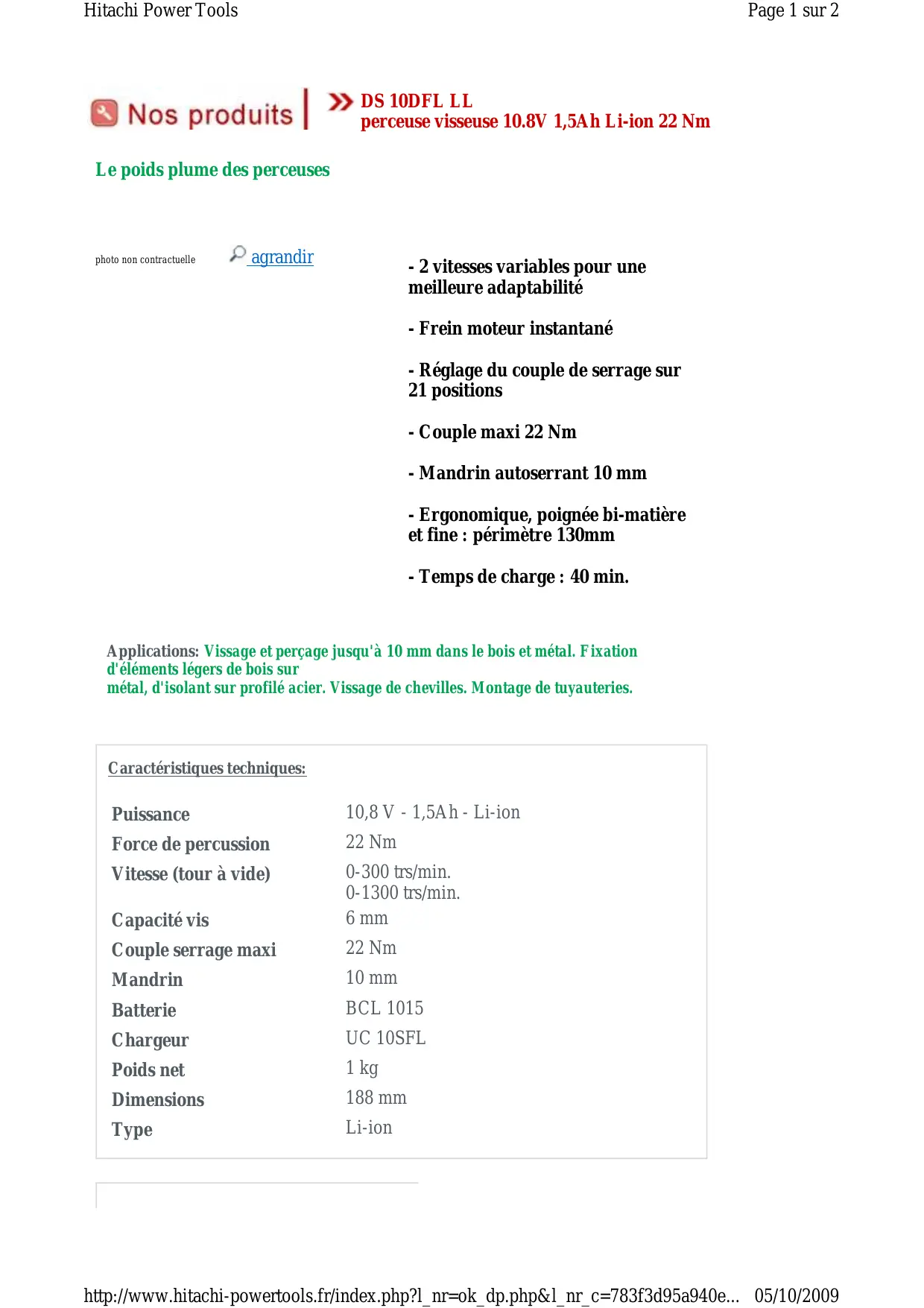 Nos prod uits perceuse visseuse 10,8V 1,5Ah Li-ion 22 Nm Le poids plume des perceuses N a # agrandir : i photo non contractuelle _agrandir - 2 vitesses variables pour une meilleure adaptabilité - Frein moteur instantané - Réglage du couple de serrage sur 21 positions - Couple maxi 22 Nm - Mandrin autoserrant 10 mm - Ergonomique, poignée bi-matière et fine : périmètre 130mm - Temps de charge : 40 min. Applications: Vissage et perçage jusqu'à 10 mm dans le bois et métal. Fixation d'éléments légers de bois sur métal, d'isolant sur profilé acier. Vissage de chevilles. Montage de tuyauteries. Caractéristiques techniques: Puissance 10,8 V -1,5Ah- Li-ion Force de percussion 22 Nm Vitesse (tour à vide) 0-300 trs/min. 0-1300 trs/min. Capacité vis 6 mm Couple serrage maxi 22 Nm Mandrin 10 mm Batterie BCL 1015 Chargeur UC 10SFL Poids net 1kg Dimensions 188 mm Type Li-ion http://www.hitachi-powertools.fr/index.php?l nr=ok dp.php&l nr c=783f3495a940e... Page 1 sur 2 05/10/2009
