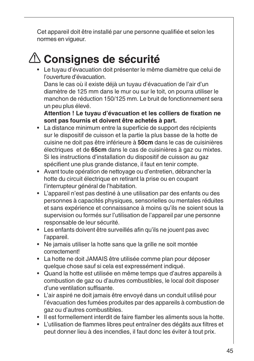Dans le cas où il existe déjà un tuyau d’évacuation de l’air d’un diamètre de 125 mm dans le mur ou sur le toit, on pourra utiliser le manchon de réduction 150/125 mm. Le bruit de fonctionnement sera un peu plus élevé. Attention ! Le tuyau d’évacuation et les colliers de fixation ne sont pas fournis et doivent être achetés à part. • La distance minimum entre la superficie de support des récipients sur le dispositif de cuisson et la partie la plus basse de la hotte de cuisine ne doit pas être inférieure à 50cm dans le cas de cuisinières électriques et de 65cm dans le cas de cuisinières à gaz ou mixtes. Si les instructions d’installation du dispositif de cuisson au gaz spécifient une plus grande distance, il faut en tenir compte. • Avant toute opération de nettoyage ou d’entretien, débrancher la hotte du circuit électrique en retirant la prise ou en coupant l’interrupteur général de l’habitation. • L’appareil n’est pas destiné à une utilisation par des enfants ou des personnes à capacités physiques, sensorielles ou mentales réduites et sans expérience et connaissance à moins qu’ils ne soient sous la supervision ou formés sur l’utilisation de l’appareil par une personne responsable de leur sécurité. • Les enfants doivent être surveillés afin qu’ils ne jouent pas avec l’appareil. • Ne jamais utiliser la hotte sans que la grille ne soit montée correctement! • La hotte ne doit JAMAIS être utilisée comme plan pour déposer quelque chose sauf si cela est expressément indiqué. • Quand la hotte est utilisée en même temps que d’autres appareils à combustion de gaz ou d’autres combustibles, le local doit disposer d’une ventilation suffisante. • L’air aspiré ne doit jamais être envoyé dans un conduit utilisé pour l’évacuation des fumées produites par des appareils à combustion de gaz ou d’autres combustibles. • Il est formellement interdit de faire flamber les aliments sous la hotte. • L’utilisation de flammes libres peut entraîner des dégâts aux filtres et peut donner lieu à des incendies, il faut donc les éviter à tout prix. 45