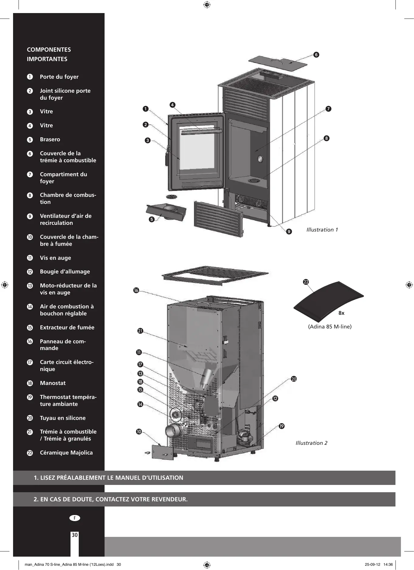B. Installation du poêle et du conduit de fumée L’agencement du conduit de fumée/cheminée est très important pour le bon fonctionnement et l’utilisation du poêle en toute sécurité. C’est pourquoi l’installation totale ou partielle du système (poêle + conduit de fumée) doit être exclusivement effectuée par des techniciens qualifiés agréés. Prière de vous référer au manuel d’installation. Le conduit de fumée doit toujours être propre car les dépôts de suie ou de résidus non brûlés peuvent l’obstruer. L’accumulation des dépôts de suie ou des résidus peut même s’enflammer et créer des situations dangereuses. Faites ramoner et nettoyer la cheminée en respectant la législation locale ou les prescriptions de votre assurance. En l’absence de législation et/ou d’instructions de votre compagnie d’assurance : veillez à ce que tout le système (ycompris le conduit de fumée) soit vérifié et entretenu par un spécialiste agréé au moins deux fois par an (la première fois au début de la saison de chauffage). Si vous utilisez le poêle de façon intensive, faites nettoyer la totalité le conduit de fumée plus fréquemment. Faites obligatoirement placer un chapeau de cheminée sur le conduit d’évacuation de fumée, en prévention de nids d’oiseaux. Veillez à ce que le chapeau de cheminée soit toujours propre et ne gêne pas le passage de l’air. Tout obstacle au passage de l’air peut susciter des situations dangereuses. Le tirage des gaz de carneau est réalisé à l’intérieur du poêle grâce à un ventilateur. L’installation de ventilateurs auxiliaires à l’intérieur du système de cheminée ou d’évacuation des gaz de carneau peut compromettre le bon fonctionnement du ventilateur d’extraction de la fumée et doit donc être évitée.