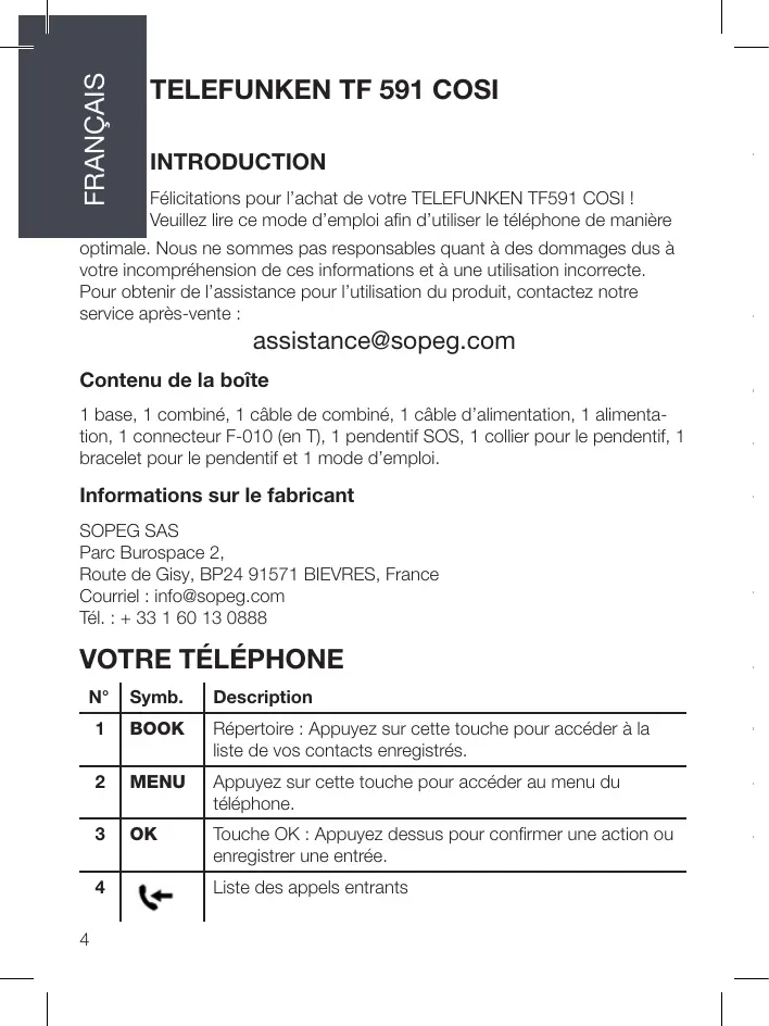 Felicitations pour l'achat de votre TELEFUNKEN TF591 COSI!