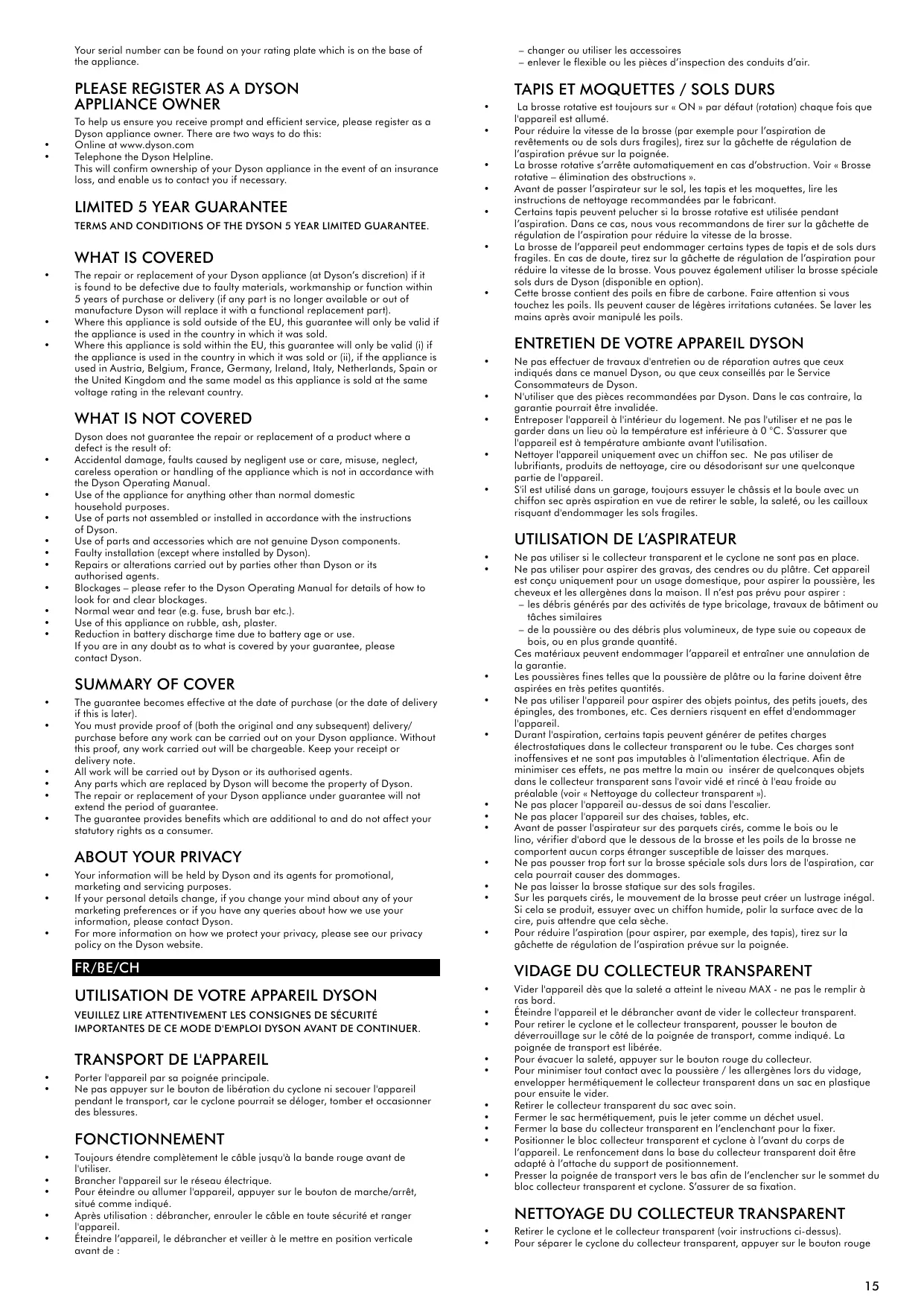 CH Si vous avez des doutes concernant l’étendue de votre garantie, veuillez téléphonez au service d’assistance Dyson : 0848 807 907.