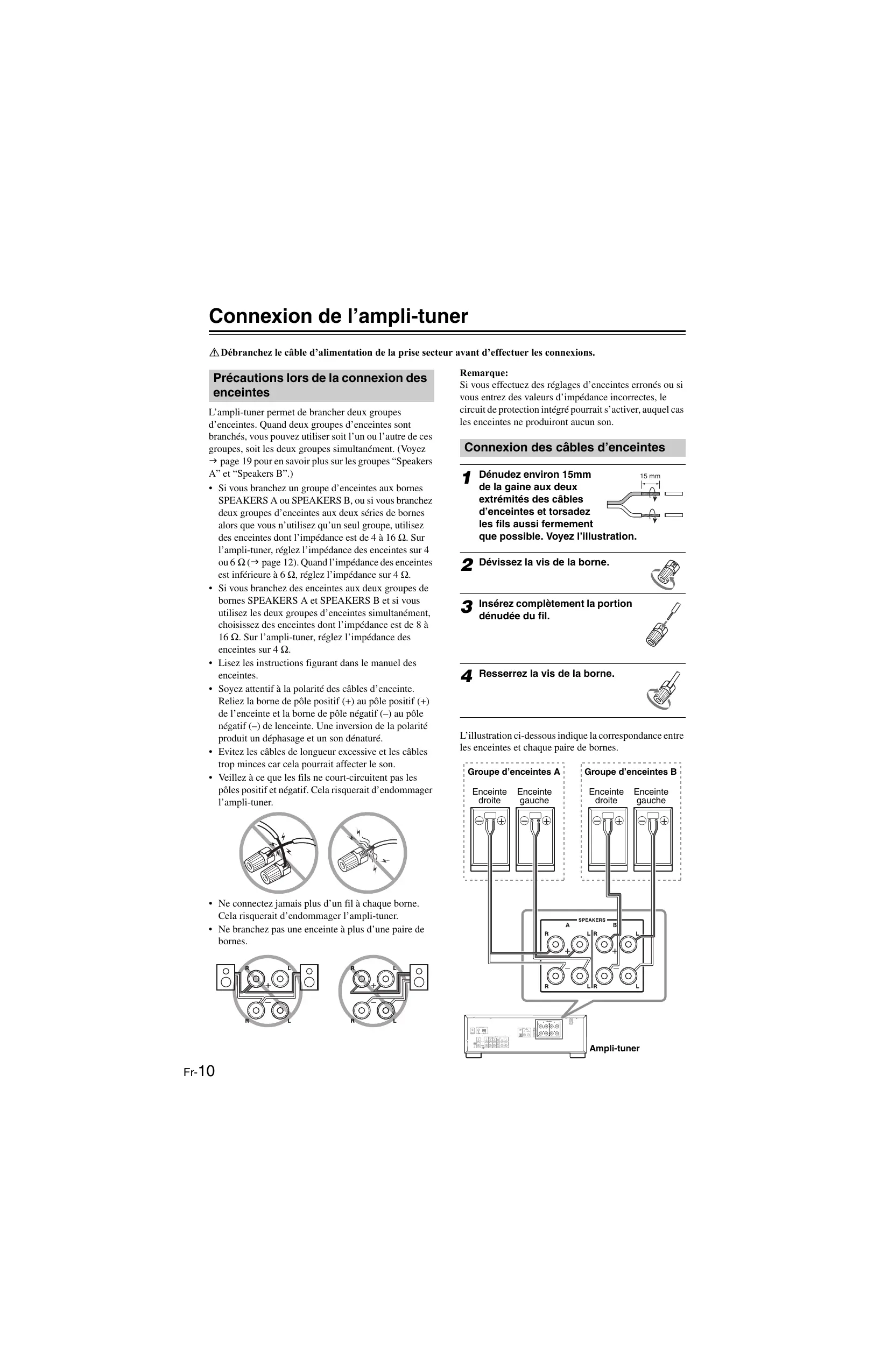 • Ne connectez jamais plus d’un fil à chaque borne. Cela risquerait d’endommager l’ampli-tuner. • Ne branchez pas une enceinte à plus d’une paire de bornes.