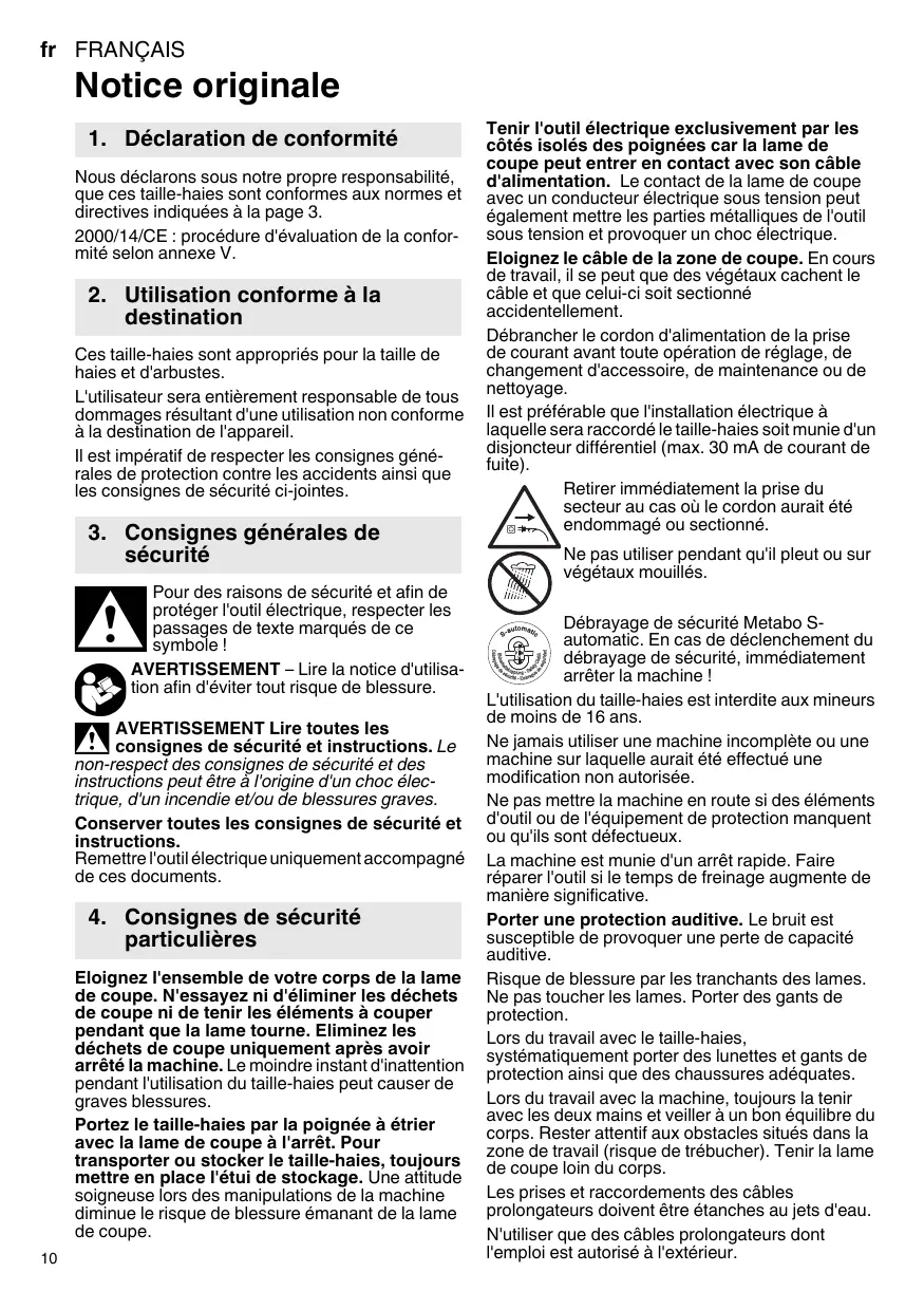 Il est préférible que l'installation électrique à laquelle sera raccordé le taillie-haies soit munie d'un disjoncteur différentiel (max. 30 mA de courant de fuite).