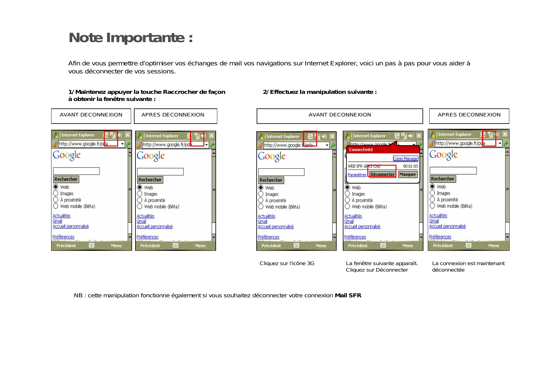 Note Importante : Afin de vous permettre d’optimiser vos échanges de mail vos navigations sur Internet Explorer, voici un pas à pas pour vous aider à vous déconnecter de vos sessions. 1/ Maintenez appuyer la touche Raccrocher de façon à obtenir la fenêtre suivante : AVANT DECONNEXION APRES DECONNEXION 2/ Effectuez la manipulation suivante : AVANT DECONNEXION Cliquez sur l’icône 3G La fenêtre suivante apparaît. Cliquez sur Déconnecter NB : cette manipulation fonctionne également si vous souhaitez déconnecter votre connexion Mail SFR APRES DECONNEXION La connexion est maintenant déconnectée Guide de prise en main du PDA Communicant SFR v1620
