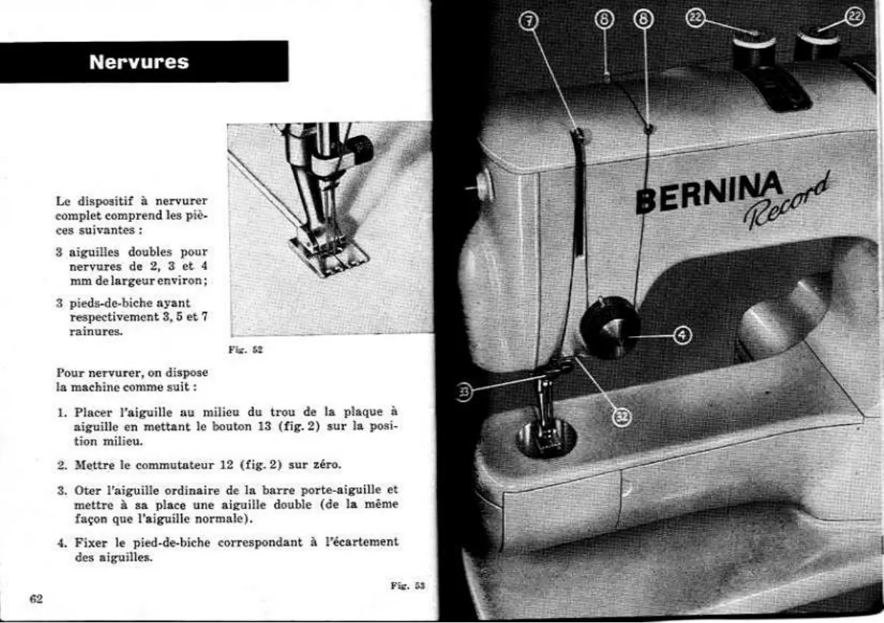 Pour les nervures avec cordonnet, ce dernier, provenant de la pelote qu'on place sur l'une des tiges porte-bobine du coffret à accessoires, passe dans la rainure du cou- vercle rabattable, d'où on le remonte pour le faire passer