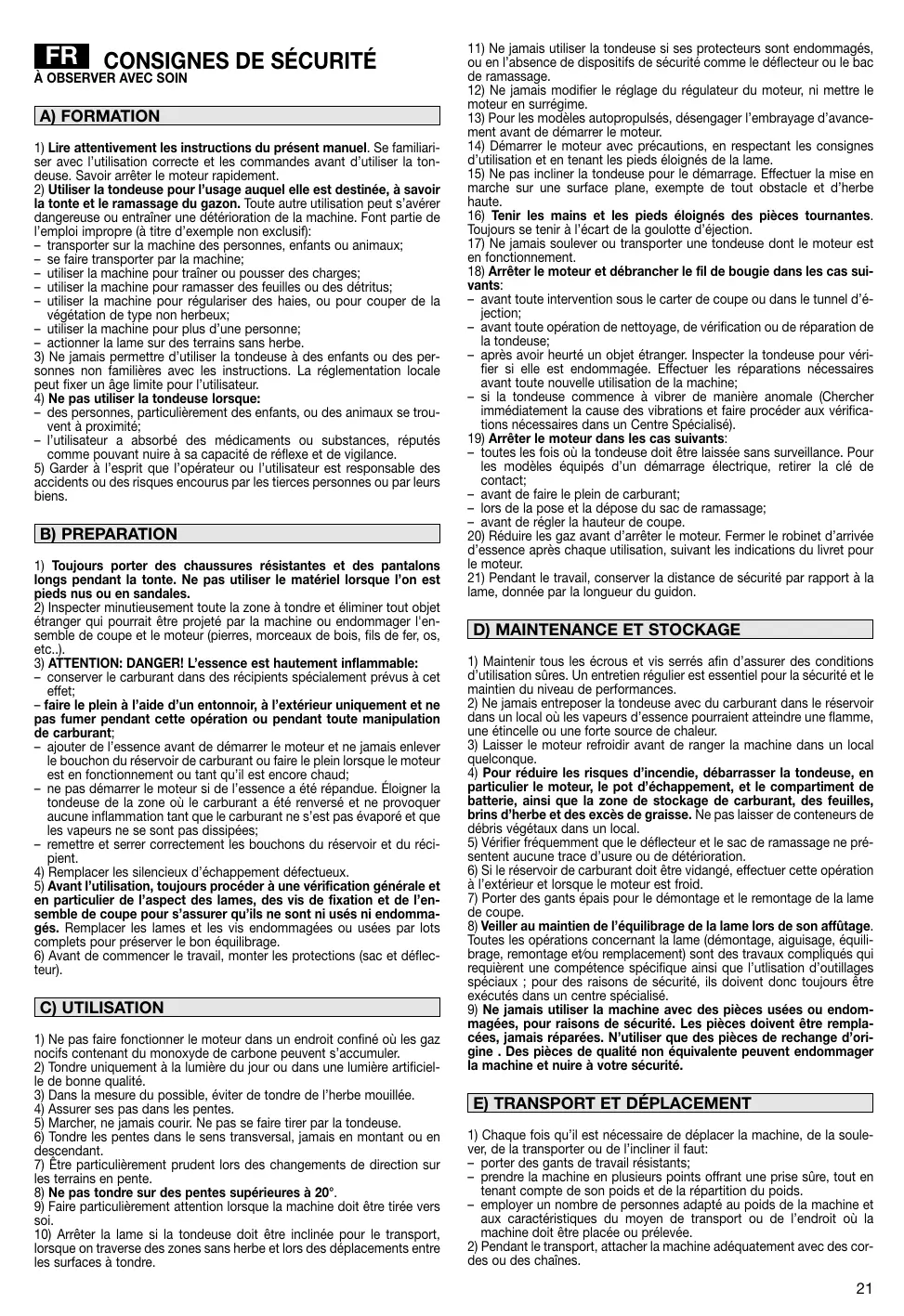 – toutes les fois où la tondeuse doit être laissée sans surveillance. Pour les modèles équipés d’un démarrage électrique, retirer la clé de contact; – avant de faire le plein de carburant; – lors de la pose et la dépose du sac de ramassage; – avant de régler la hauteur de coupe.